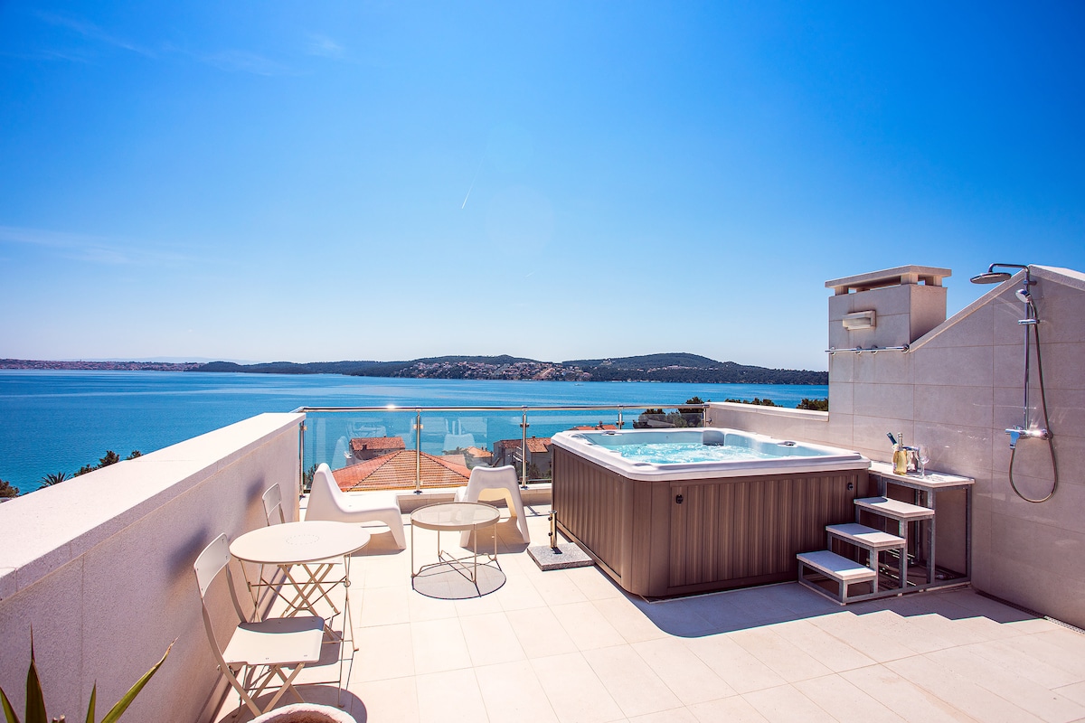 Royal is new, modern & luxury renovated apartment with jacuzzi, 50 meters away from beach. Has 50 square meters and 30 square meters terrace. Comes with 2 bedrooms, a living room, a fully eqipped kitchen with a dining area, bathroom with great shower, barbecue facilities, garage(1 car) , flat-screen TV in every room and free wi-fi. Offers a big terrace with open sea view on surrounding islands. Diving can be enjoyed nearbly. Trogir is 5 km away and Split airport 8 km from the acommodation.