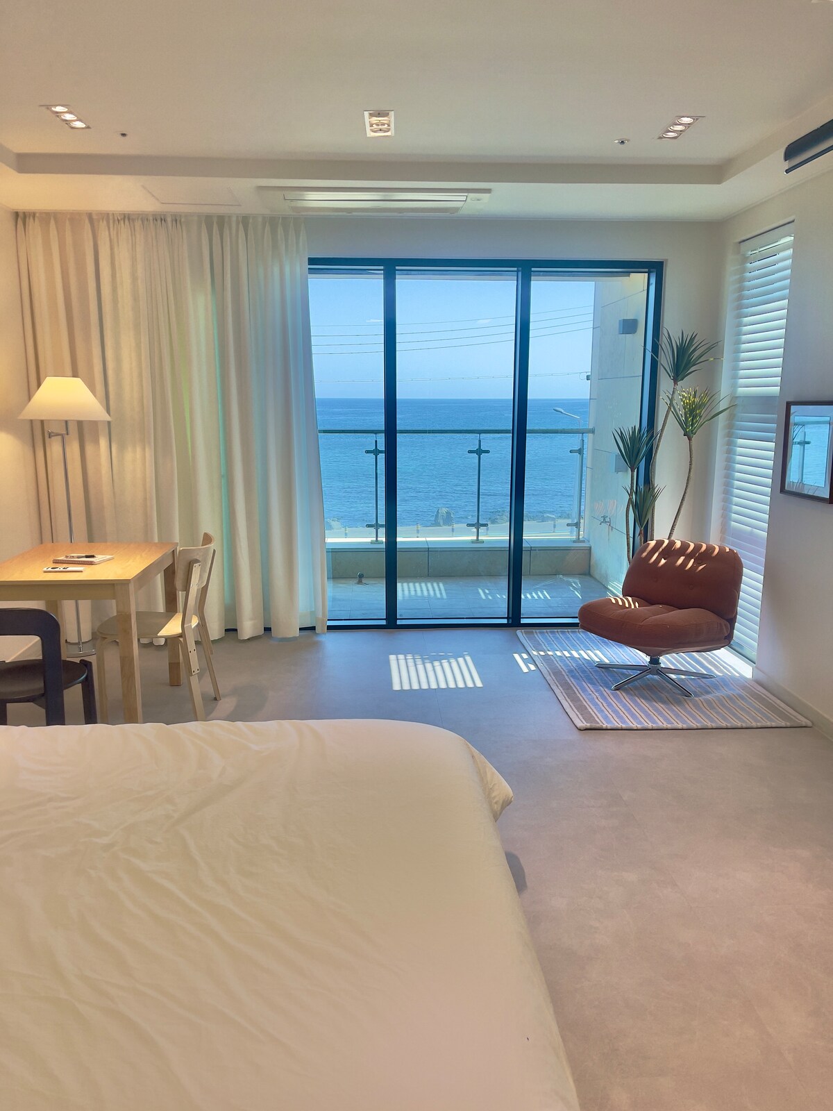 Hello. We want to create a space where you can forget the frustration of the city by facing the sea and using the sound of the waves. Our space, located 20 minutes from the airport, offers all rooms with a view of the blue sea of Jeju right in front of you. Space composition 3rd floor 12 sqm space (elevator access) 1. Bedroom space : The room is a studio-type space where you can cook. Bed, wall-mounted TV, tea table and dining table for two, hanger, stand, sink, air conditioner, small refrigerator (freezer not included), induction 2. Kitchen : Tableware and kitchen utensils for 2 3. Bathroom : Sunflower shower, towel, shampoo, conditioner, body wash, soap, toilet paper (Please note that toothbrushes are not available due to hygiene management laws.) 4. Terrace 5. Barbecue area Ocean barbecue connected to the sea: 20,000 KRW (charcoal and grill are prepared.) Next to the lobby, there is a separate barbecue area in case of rain. 6. Parking lot: Electric parking is possible. 7. Please request a separate laundry room and dryer at the entrance on the 1st floor. Thank you.