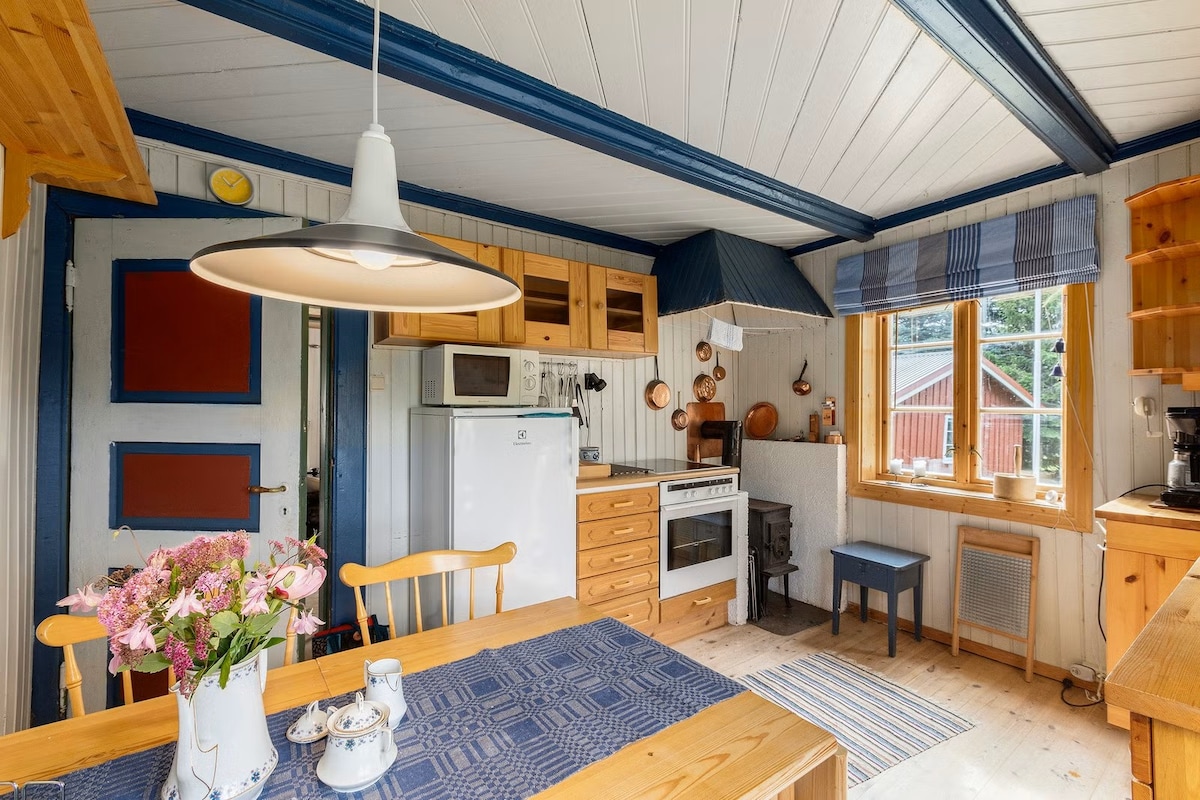 Charming log cabin on the top with a lovely view! Two bedrooms, loft and annex provide plenty of space. Wood stove provides cozy cabin comfort :) Running water for shower and cooking (drinking water is available in cans). Ski slope right behind the cabin, fishing lake about 10 min walk away. Canoe and Nintendo Switch available. Perfect for family vacations, a weekend with your significant other or quiet days in nature - all year round. Very good sun conditions - summer and winter. Charcoal grill is available on the terrace and a fire pit for pleasant evenings is by the view.