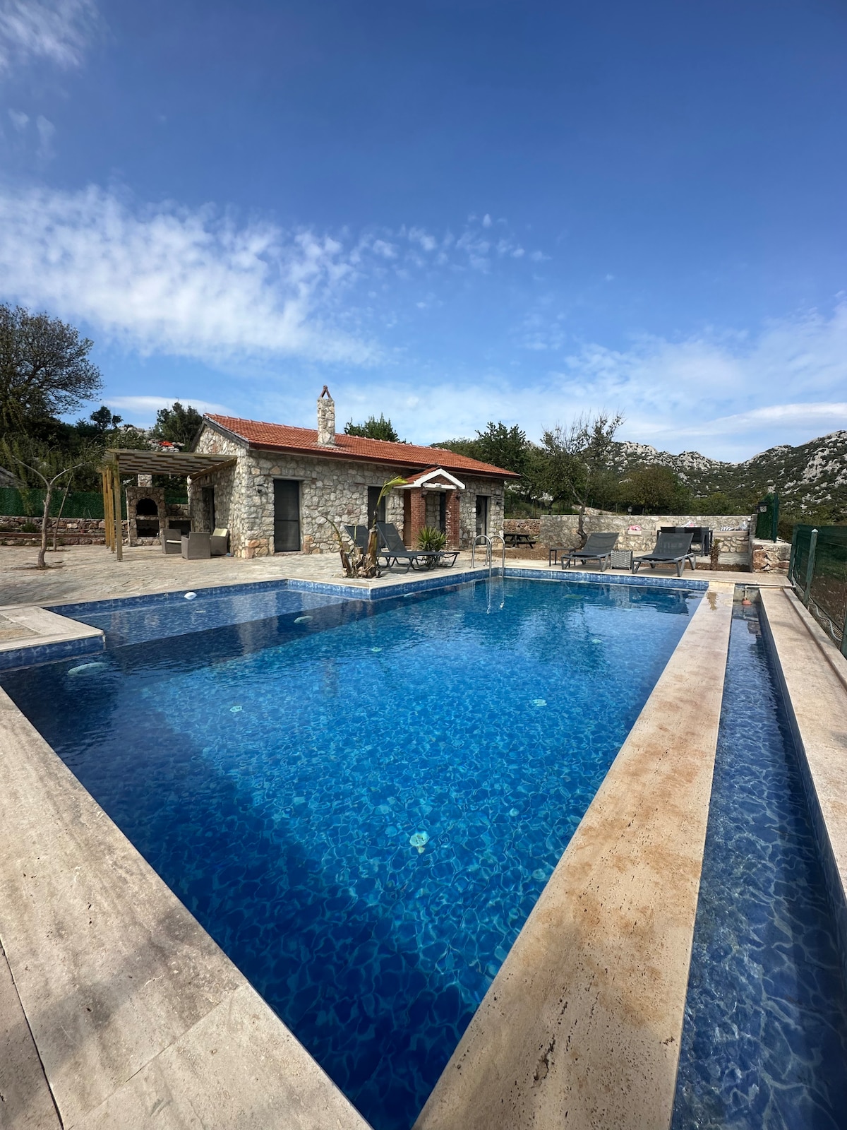 Our wooden villa with a private pool (heated in winter) in Hisarönü, Marmaris, allows you to have a quiet holiday with its garden and pool. It offers easy access to the beach in 5 minutes by car, to the bays of Marmaris in half an hour, and to Marmaris in 15 minutes. You can enjoy the organic fruits and vegetables in our garden and create pleasant memories with your family and friends using our barbecue. @alibabahomess