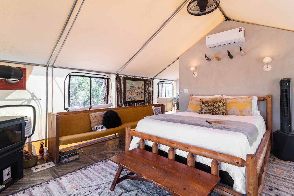 Welcome to Oak Retreat! Oak Retreat is luxury glamping at its best, located just 15 miles south of downtown, our tent includes a king size bed, A/C, en-suite bathroom with walk-in shower, private hot tub, coffee, wifi, and more. Relax outdoors, take a nap in your hammock chairs, indulge in a soak in your private hot tub or snuggle in bed while you watch a movie on your own projector. Oak Retreat has everything you'll need for a relaxing stay in the hill country.
