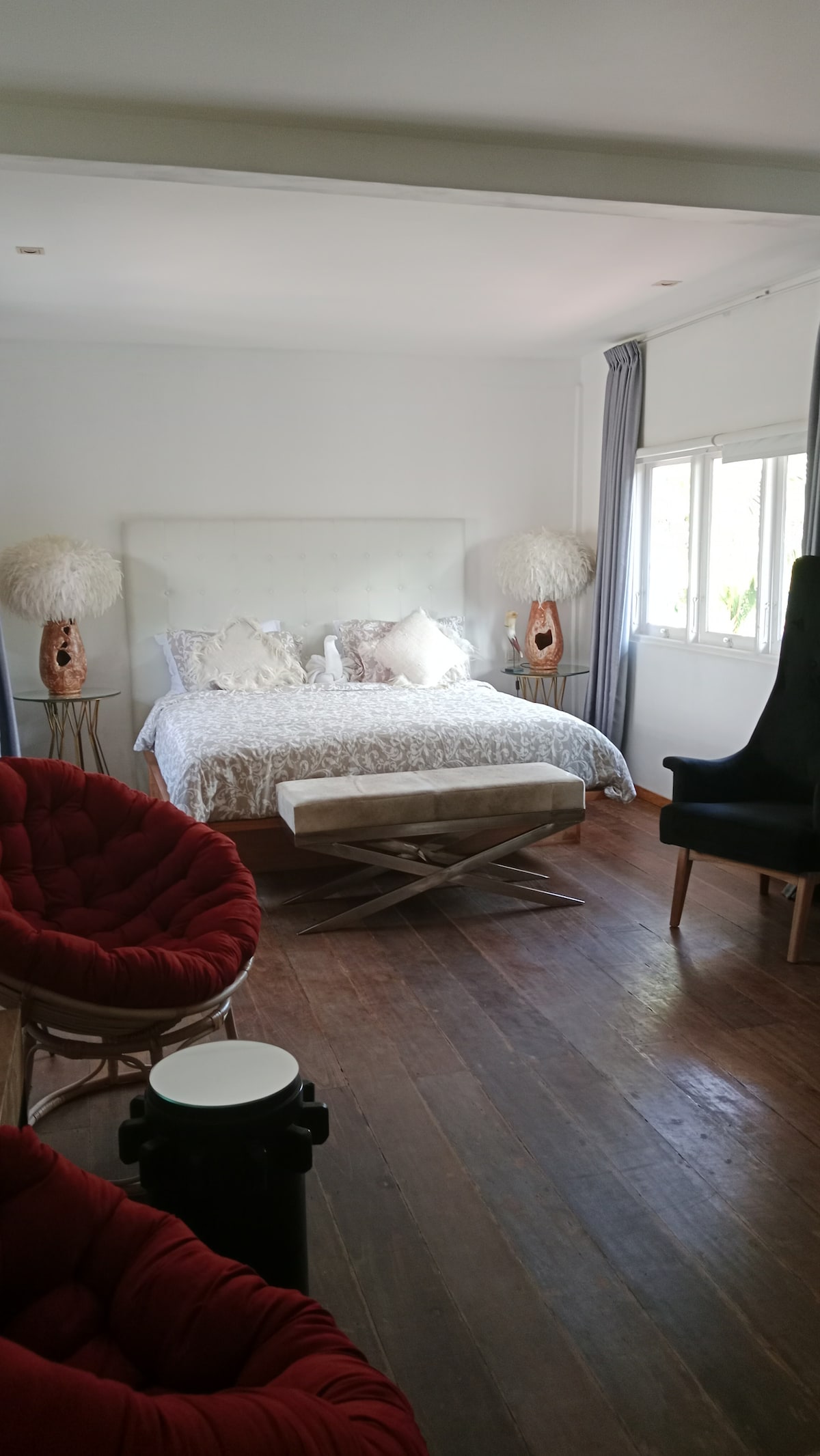 Discover many surprising ways to unwind in this self-contained Villa Bungalow within our sprawling estate. Wander lush gardens, sway in a vintage-style tandem swing, or relax by the natural stone pool. Soak in a designer tub or choose a book that tickles your fancy and relax on the breezy patio/veranda daybed. Your King Bed is like sleeping on a cloud. Also included: - Separate kitchen - Daily maid/housekeeping service - Up to 150mbps Wifi - 8-10 min walk to the beach - Peaceful, quiet