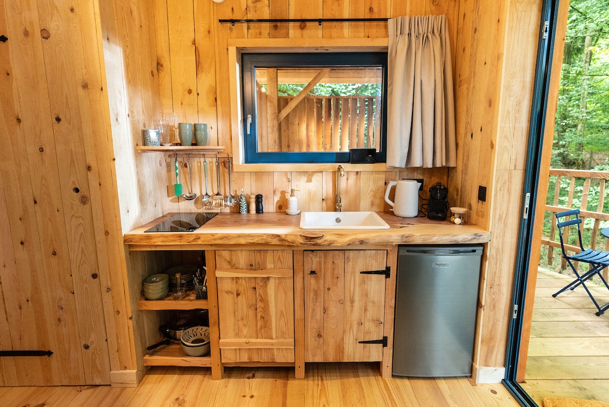 Our beautiful treehouse has been built with the utmost respect for the surrounding nature, overlooking a beautiful pond and with a large private outdoor space. Built with beautiful materials, the exterior was made with old pine boards from very old dismantled chalets in the Pyrenees. The roof is made of cedar shingles that give a very natural look by blending perfectly with this beautiful nature. Our lovely cabin sleeps two people You will spend the night in a large, very welcoming and ultra comfortable 160 cm bed. When you arrive the bed is already made, sheets, duvet, blankets and pillows are present. A dry toilet of course, a small sink provides you with drinking water at room temperature. Towels are at your disposal. In winter, you can enjoy a pleasant and gentle warmth thanks to the small wood-burning stove that crackles at the foot of the bed. Everything is on site, the small kindling wood, the logs, the firelighters, the matches... Electricity is supplied by solar panels installed on the property for lighting and charging mobile phones. In the small fridge, drinks are available at no extra cost. In the morning around 8 a.m., a delicious breakfast is served on the terrace. We come discreetly so as not to wake you, but don't take too long to take possession of it because the squirrels are there and they shouldn't leave with the pastries ;-) During the summer period you can enjoy the beautiful terrace overlooking the pond where ducks, herons, aquatic turtles and other water birds mingle and have your breakfast among this beautiful nature. If you want to enjoy the nocturnal animal life, it is recommended to leave the curtain open to admire many small animals coming to feed in the small feeder on the window 50 cm from you, the squirrels come from sunrise and the birds throughout the day. A list of some restaurants in the village is available if you want to eat in the evening as well as photos with the names of the small animals often encountered in the woods. In short, everything is done to make you have a great experience and a sweet night in the heart of nature.