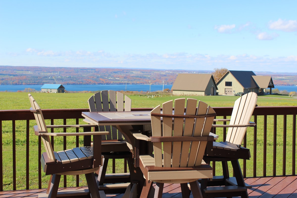Let the calm, quiet beauty of New Yorkโs Finger Lakes region renew you at this modern and bright on-farm escape right on the Seneca Lake Wine Trail. Enjoy our outdoor space and the comfort of our new building's private second floor which features natural lighting, a private entrance, self check-in, marble countertops, tile throughout, a custom bathroom, in-floor radiant heat, WiFi, no TV and a spacious deck overlooking Black Squirrel Farms, a black walnut growing and processing operation.