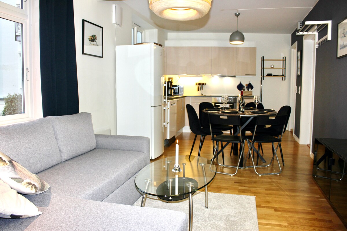 This second-floor apartment is in an excellent location in Nordnes, Bergen. It is in the heart of the city, just a five-minute walk from all the city's popular attractions. It is well-equipped with modern amenities. The neighborhood is clean, peaceful, and has minimal traffic, making it an ideal place for a short or longer stay in the city. Parking facilities, a café and bistro, a grocery store, a bakery, and a bar within walking distance add to the overall appeal of the apartment.
