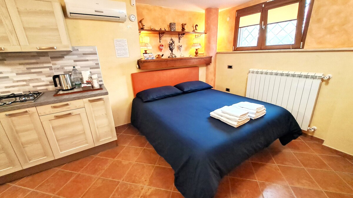 "Il Nido" is a romantic and cozy two-room apartment on two floors, at the foot of the Castle, in the ancient heart of Sermoneta, a splendid perfectly preserved medieval village, a stone's throw from the enchanting "Oasis of Ninfa", the archaeological excavations of the Ancient Norba and the sea of Ulysses. The double bedroom is on the ground floor, while on the upper floor there is the kitchen, the small equipped bathroom-shower and a balcony, overlooking the ancient Piazza del Comune and the Loggia dei Mercanti.