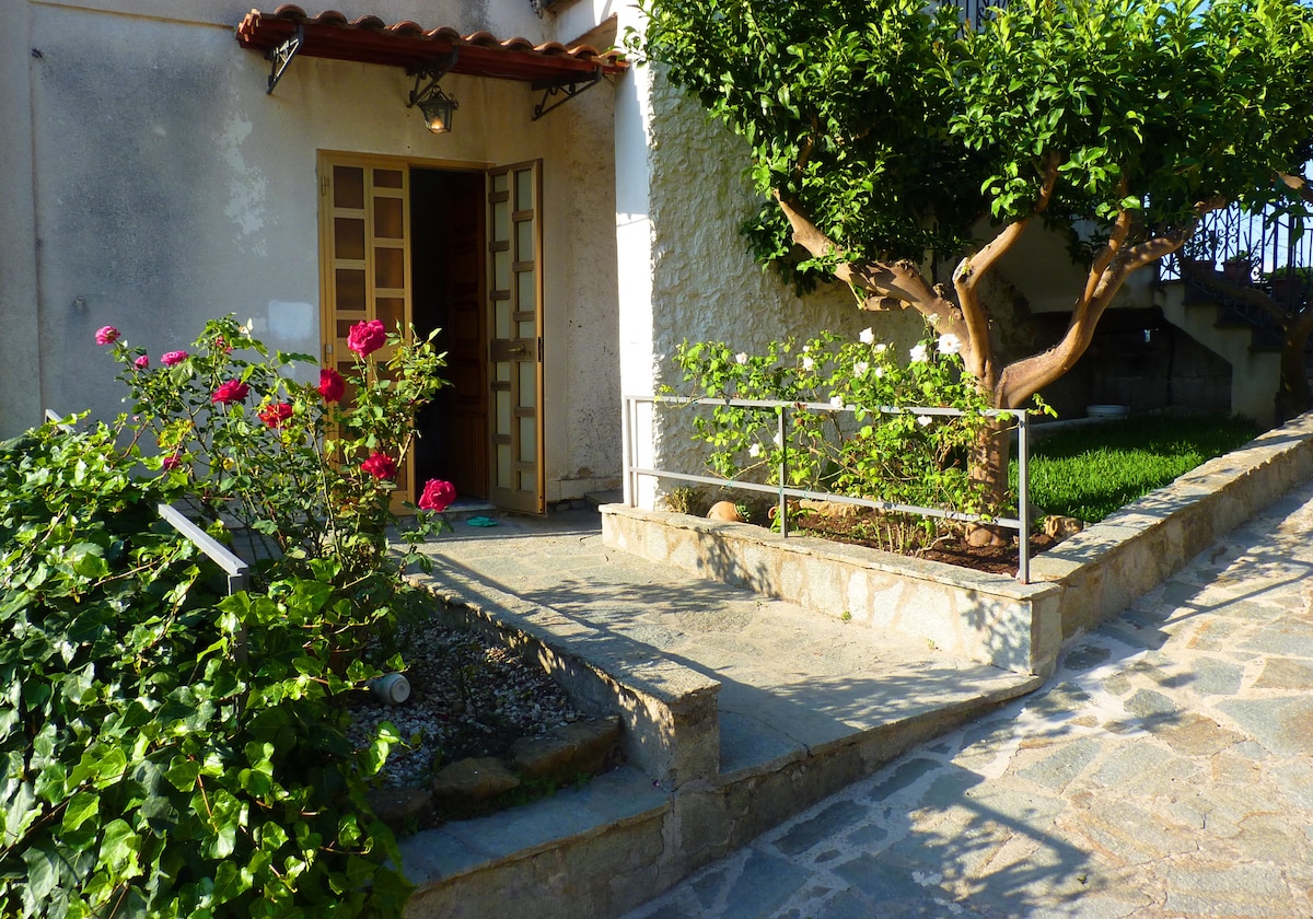 Delightful panoramic stone farmhouse from 1890, overlooking the sea, surrounded by one hectare of olive grove and fruit trees. It has a living room with fireplace and double sofa bed, a bathroom, a fully equipped kitchen, double bedroom and a loft with two beds. It has a large terrace of 70 square meters with a pergola and a barbecue for your dinners. A unique view in quiet and unspoiled environment. Distant 1.2 km from the village and beaches. Satellite Internet with Starlink