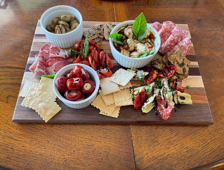 Aperetivo is the famous Italian pre-dinner " Happy Hour". Delightful spreads of cured meats and cheese accompanied by a large choice of small bites. A very sociable concept. perfect for small or large groups!