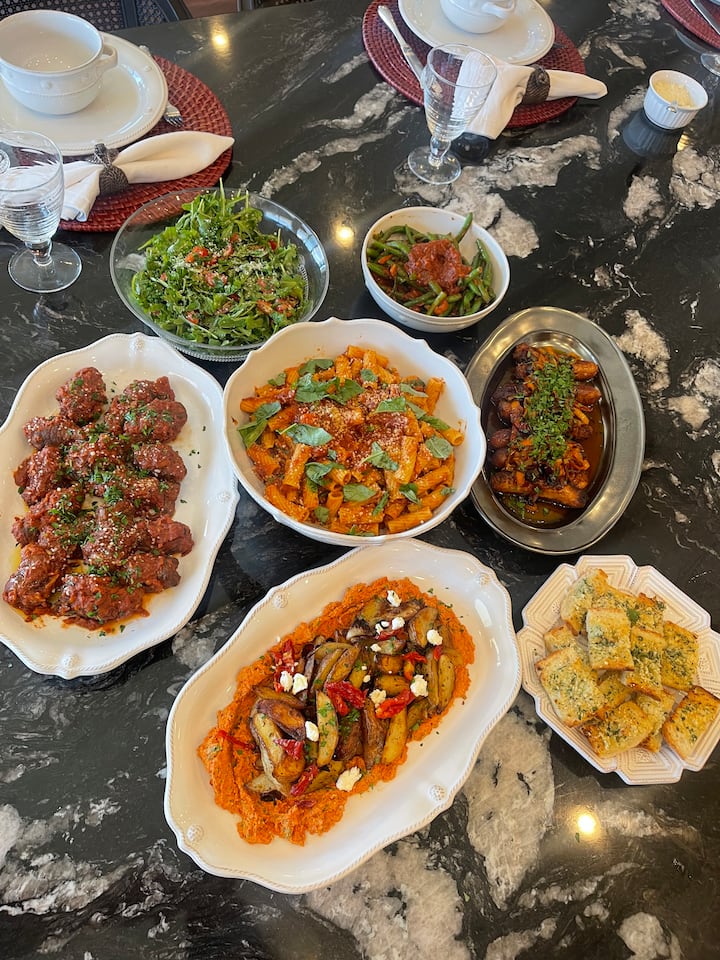 The dinner table covered with large spreads of hearty pastas, saucy meatballs, crispy chicken cutlets and luscious salads. And of course baskets of garlic bread. Now that’s what a family style dinner is supposed to be and that’s precisely what this service offers.