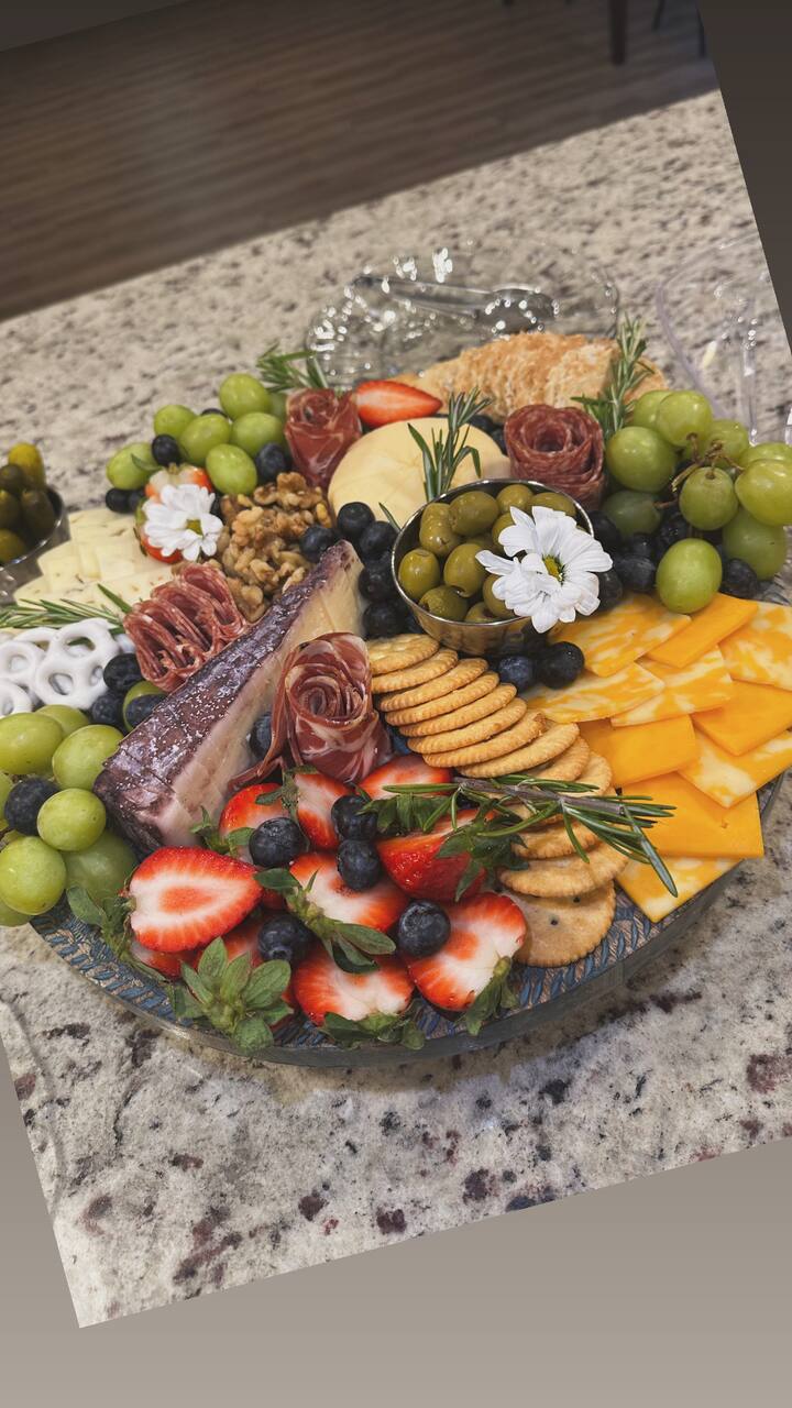 The charcuterie board features a selection of cheeses and meats, arranged to match favorite preferences. Enjoy a visually appealing spread that encourages sharing and conversation. Ideal for gatherings where guests can sample a range of flavors.