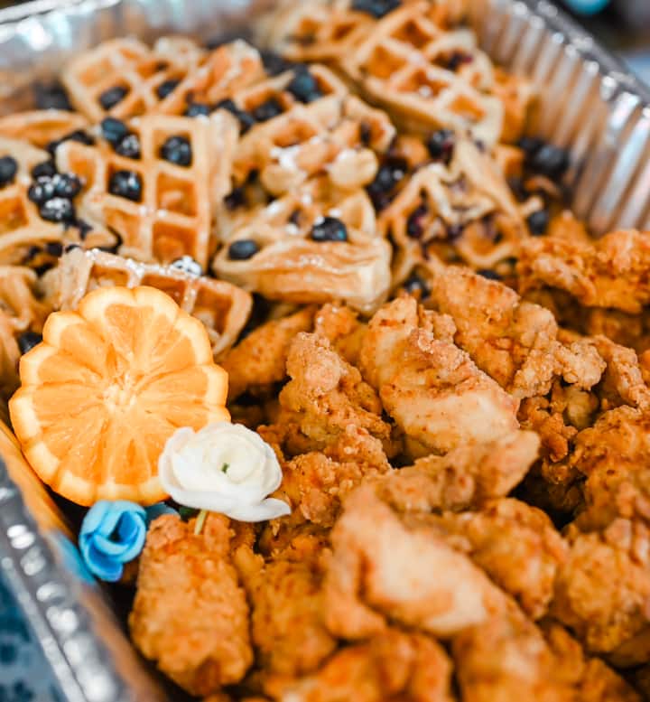 The brunch menu includes crispy chicken and waffles, French toast, creamy grits, breakfast potatoes, bacon or sausage, and fresh fruit. Each dish is thoughtfully prepared for a satisfying meal. The menu brings together sweet, savory, and hearty options for a complete brunch.