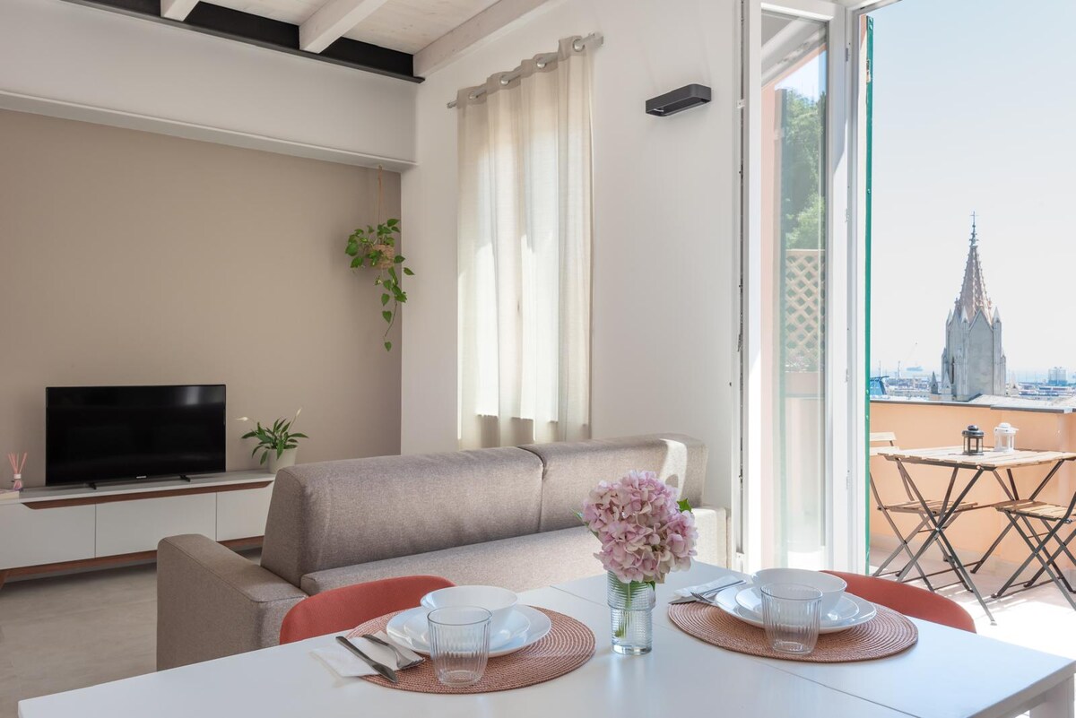 Relax in the romantic atmosphere of this bright apartment with a bohemian soul, with a panoramic view over the city's rooftops. Right in the heart of the historic center, in a quiet and peaceful setting, 150 meters from the sea and open air life. Ideal location for those traveling by train (Acquarium) and for travelers looking for the true Genoese experience: walking in the maze of its alleys full of life and shops. Located at the top of a tower with a lift, in a pedestrian area.