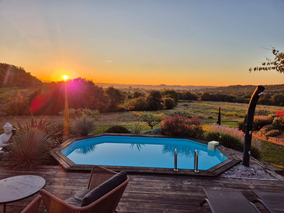 Welcome to "Au p'tit chalet". This pleasant 42 m2 cottage with its large pine wood terrace will charm you with its tranquility, its breathtaking view of the vineyards and our beautiful Etang de Thau. Conducive to daydreaming while tasting local Mediterranean products, you will find here a peaceful place, where you can recharge your batteries while being close to the sea and seaside resorts. Ideal location for families. Close to Marseillan, Agde and Pezenas. Swimming pool: from April to November.