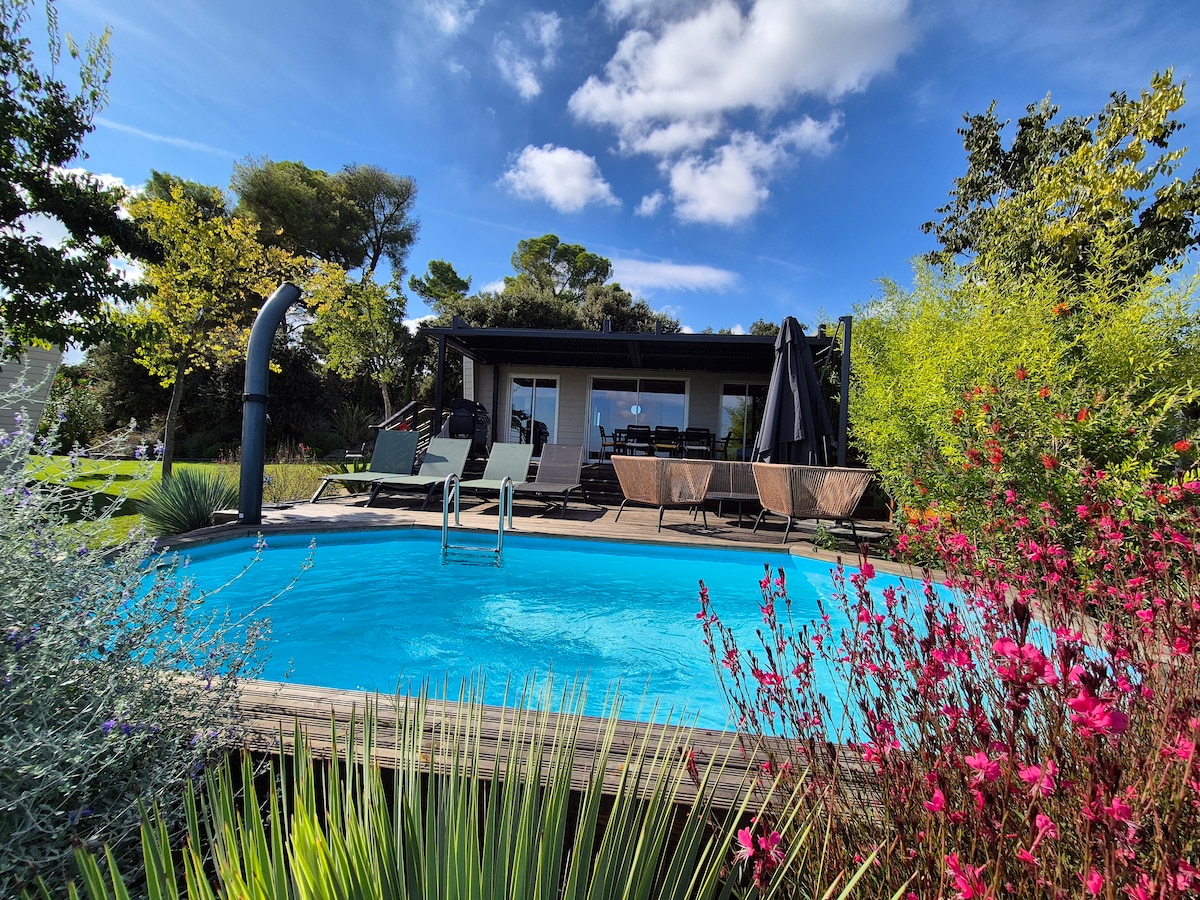 Cozy cottage on private estate among the vines. 5 minutes from the beaches, the Thau lagoon and all shops. 2 swimming pools, 1 of which is enclosed and heated. Comfortable chalet with 3 large wooden terraces, garden furniture and sunbathing.