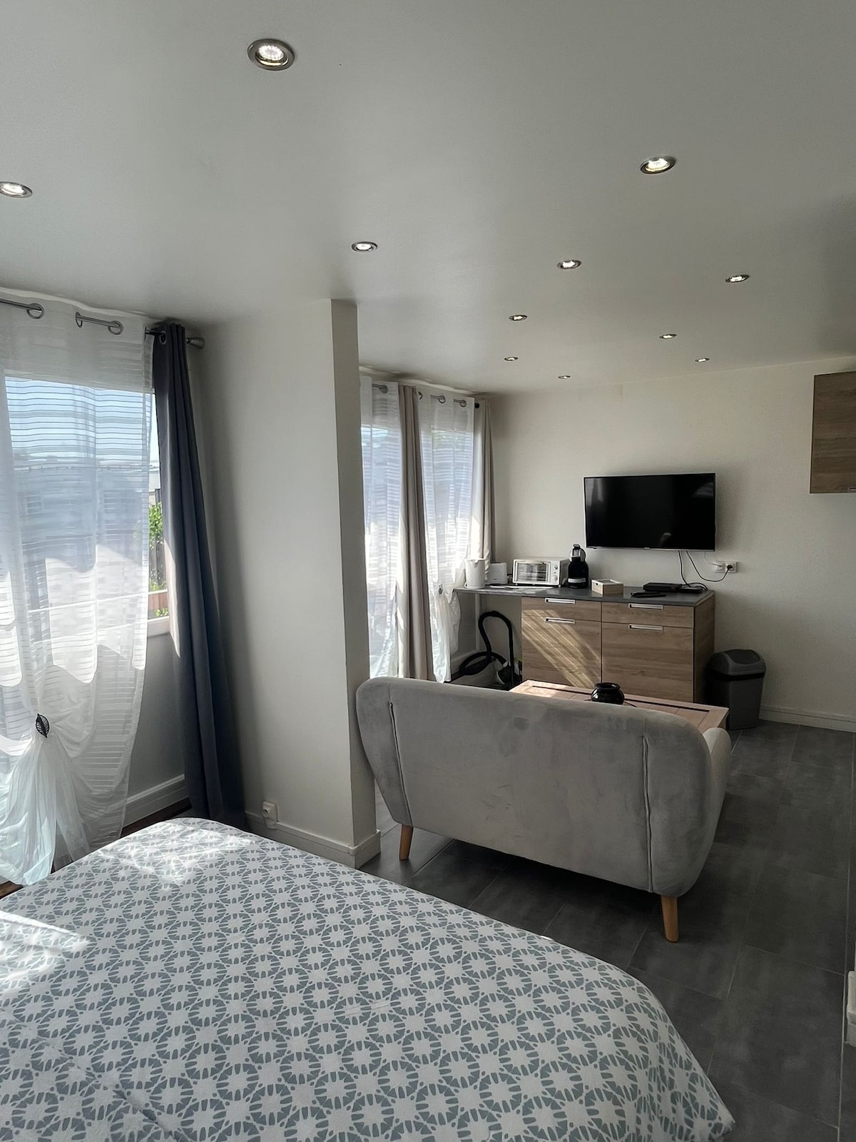 Beautiful studio with private bathroom, refurbished, for 2 people The independent accommodation on a very quiet street is 2 minutes from the T1 VILLAGE tram and Metro 13, as well as many shops. Free parking in the neighborhood (disc required) Equipped kitchen. Sofa bed 160/200 (2 single mattresses) (pull-out bed) Wi-Fi, internet TV Small private terrace. Shared outdoor entrance. Close to tourist sites: Montmartre, Champs-Élysées, Eiffel Tower, Stade de France