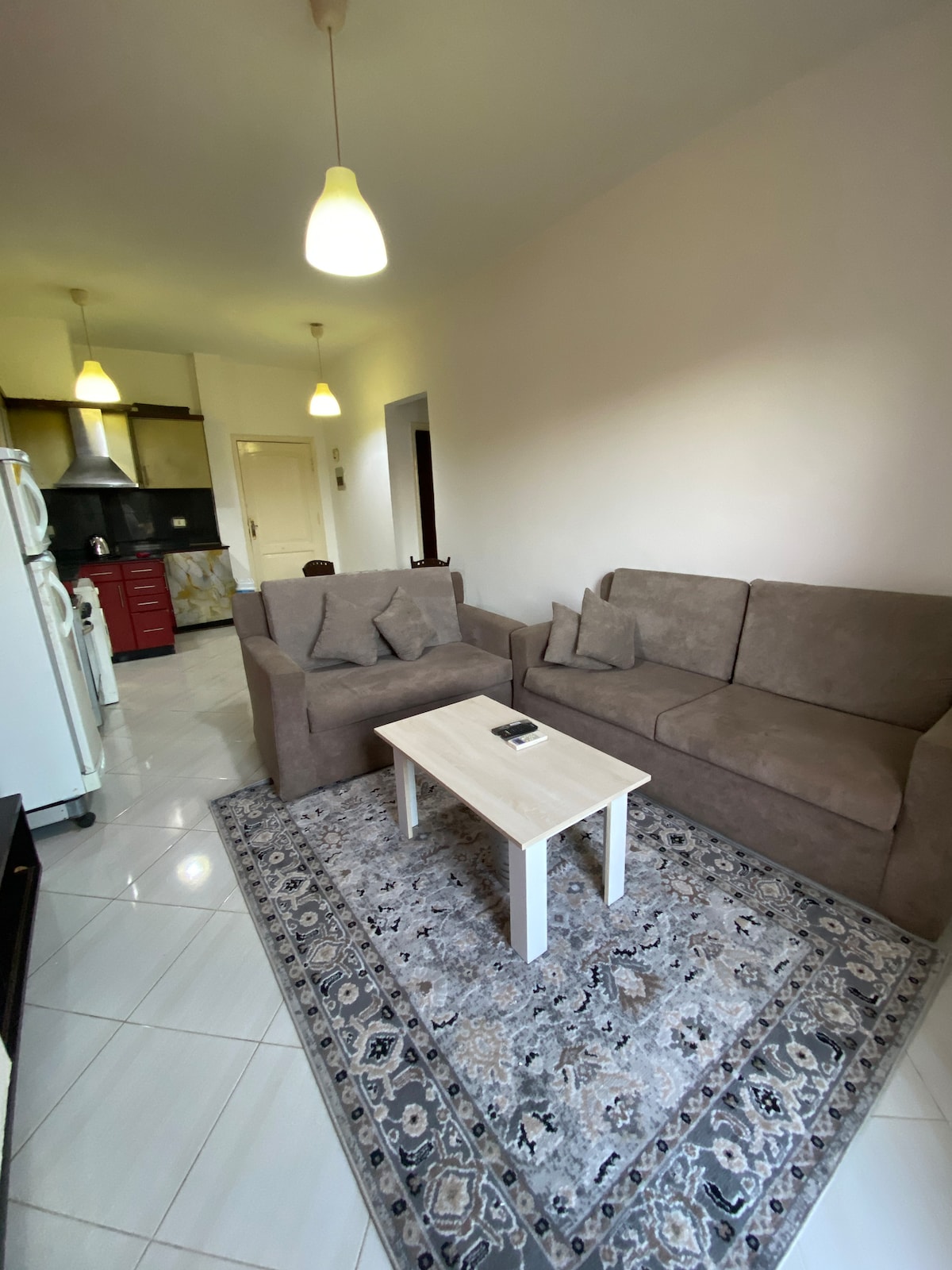 Very nice apartment, fully equipped kitchen, fully loaded appliances, AC, comfy beds, very clean, superior location, Ikea kitchen ware. The apartment is loaded with a fridge, a cook, an electric kettle, a microwave and a washing machine. There is a also a TV and WI-FI , a dining table for 3-4 people. The flat also has a terrace, where you can enjoy your time. The compound has free accessible pools.