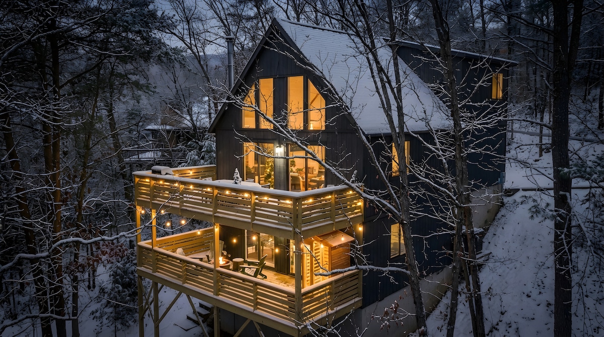 The Horizon cabin at Arête, your luxury 2 BR mountain A-frame retreat with breathtaking views. Enjoy a private two-level deck with a hot tub, cold plunge, and cedar steam sauna for ultimate relaxation. Inside, the spa-inspired bathroom offers heated floors & towel rack, and a soothing shower with five massaging heads. The kitchen is fully equipped, and you can enjoy al fresco dining using the outdoor Napoleon grill. Relax by the indoor wood fireplace or outdoor fire pit (firewood provided).