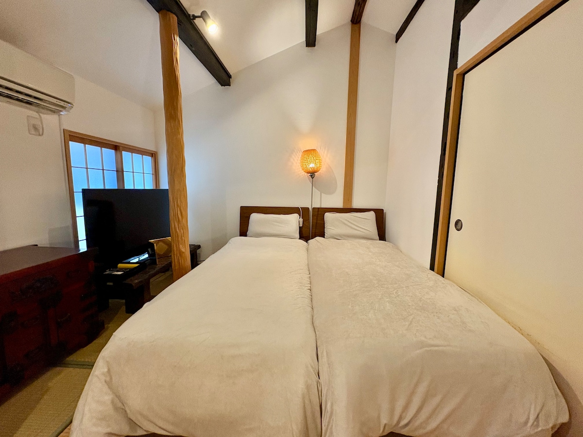 This room features 2 single beds, 2 futon sets, cooking utensils, and a kitchen, accommodating up to 4 guests. <Recommended Points> ■ Convenient location within walking distance of Shimizu-Gojo Station for sightseeing ■ Keyless stay with smart lock ■ Kitchen equipped with cooking utensils, electric kettle, and microwave ■ Perfect for long stays or business trips <Other Amenities> Air purifier, air conditioner, hair dryer, shampoo, conditioner, body soap, hangers