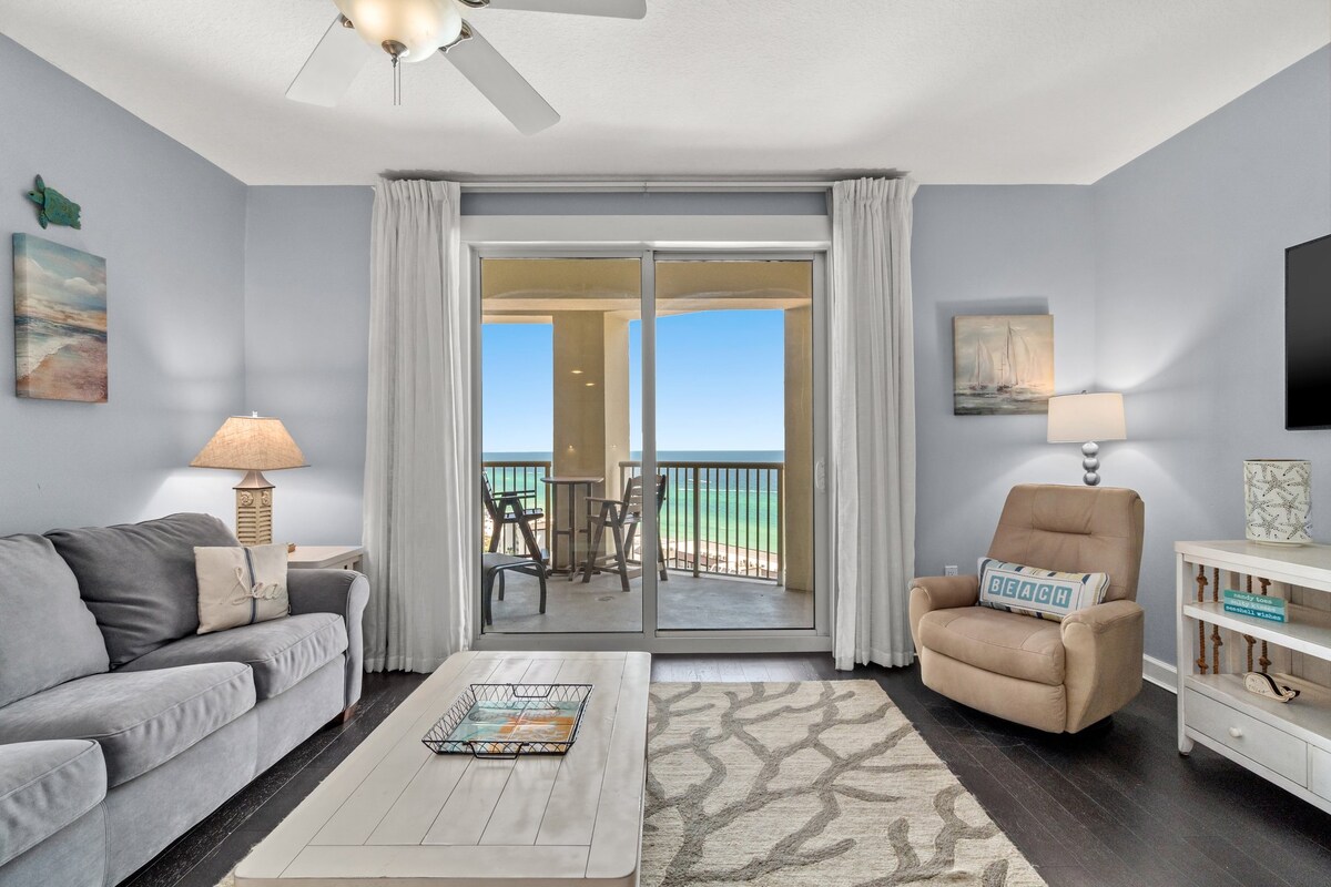 Boasting infinite Gulf views, an open floorplan, and elegant touches throughout, this deluxe, beachfront condo is guaranteed to please even the most discerning guests. The great room boasts a fantastic, full kitchen with stainless steel appliances and counter seating for three. Enjoy more formal meals together at the indoor table for six or al fresco on your furnished balcony. The cozy, sunlit living area includes a gas fireplace and a wall-mounted, flatscreen TV, while the sliding glass doors open the entire space up to the balcony. And for sleeping arrangements, this condo features three comfortable bedrooms including a "mermaid-friendly" kids' room. Guests will also enjoy access to a variety of on-site amenities including a fitness room, a seasonally-heated pool, and a hot tub.