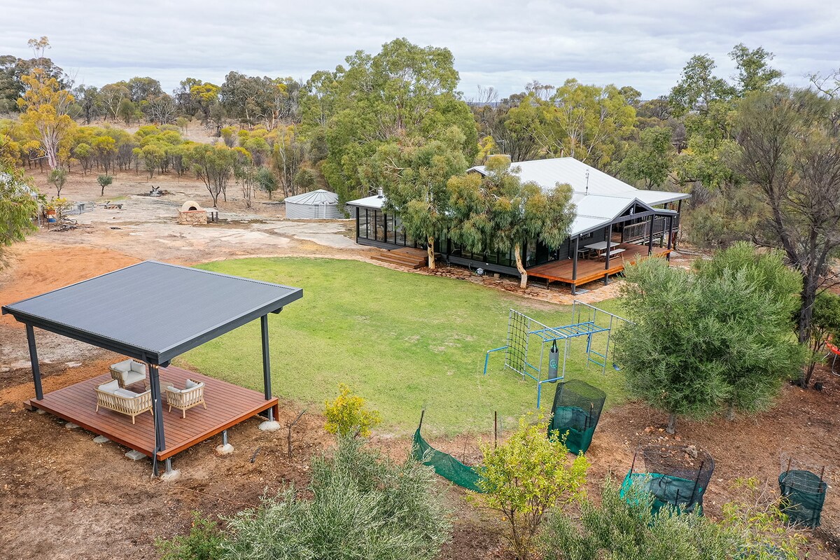 Escape the city at Talbot Lodge, nestled amidst 15 acres of Sandalwood trees just 20km southwest of York. With stunning views, cathedral ceilings, two fireplaces, a Chef's kitchen, and more, it's perfect for relaxing with family and friends. Enjoy breakfast on the verandah, explore the historic town, then unwind with wine, charcuterie, and nature's symphony at dusk. Pet farm animals, hike trails, and make memories under starry skies by the fire pit. Experience rural beauty at its best.