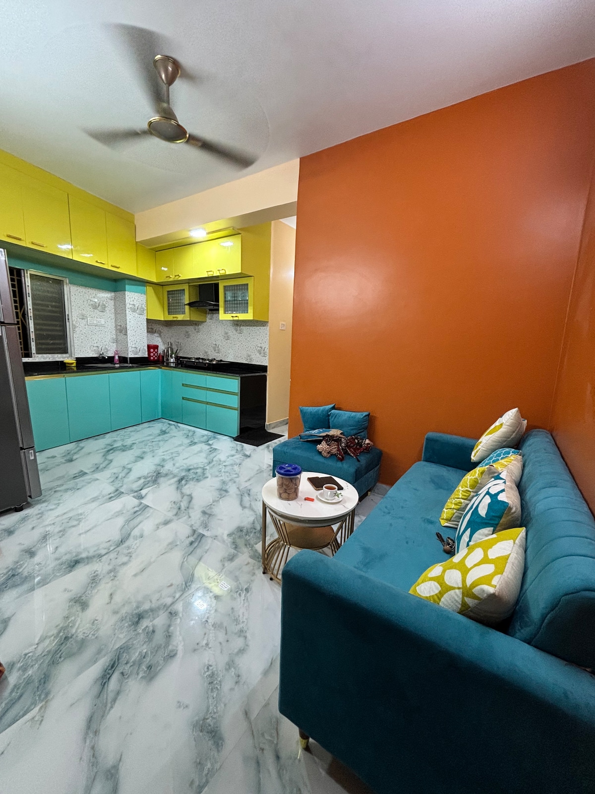 Cozy 1BHK on the ground floor with a home-theatre vibe! Enjoy a huge projector for movie nights, a fully equipped kitchen with fridge, microwave, water purifier, and all essentials. The bedroom features a snug king-sized bed, AC, and ample storage. Includes washing machine, clean bathroom with essentials, WiFi, and self-check-in for your convenience. Pet-friendly and perfect for couples, solo travellers, or long stays. Private unit with no shared spaces. Local identity proofs not accepted.