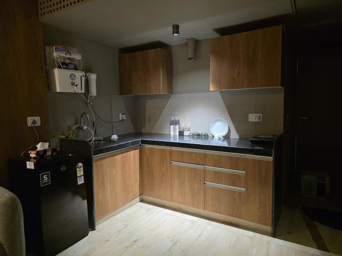 Modern luxury studio ideal for couples and business travelers. Enjoy a cozy bed, elegant interiors, and soft ambient lighting for a relaxing stay. Stay productive with high-speed WiFi and a comfortable workspace. The fully equipped kitchenette adds convenience, while free parking and self check-in ensure a hassle-free experience. Clean, private, and thoughtfully designed for comfort, work, and relaxation—your perfect home away from home.