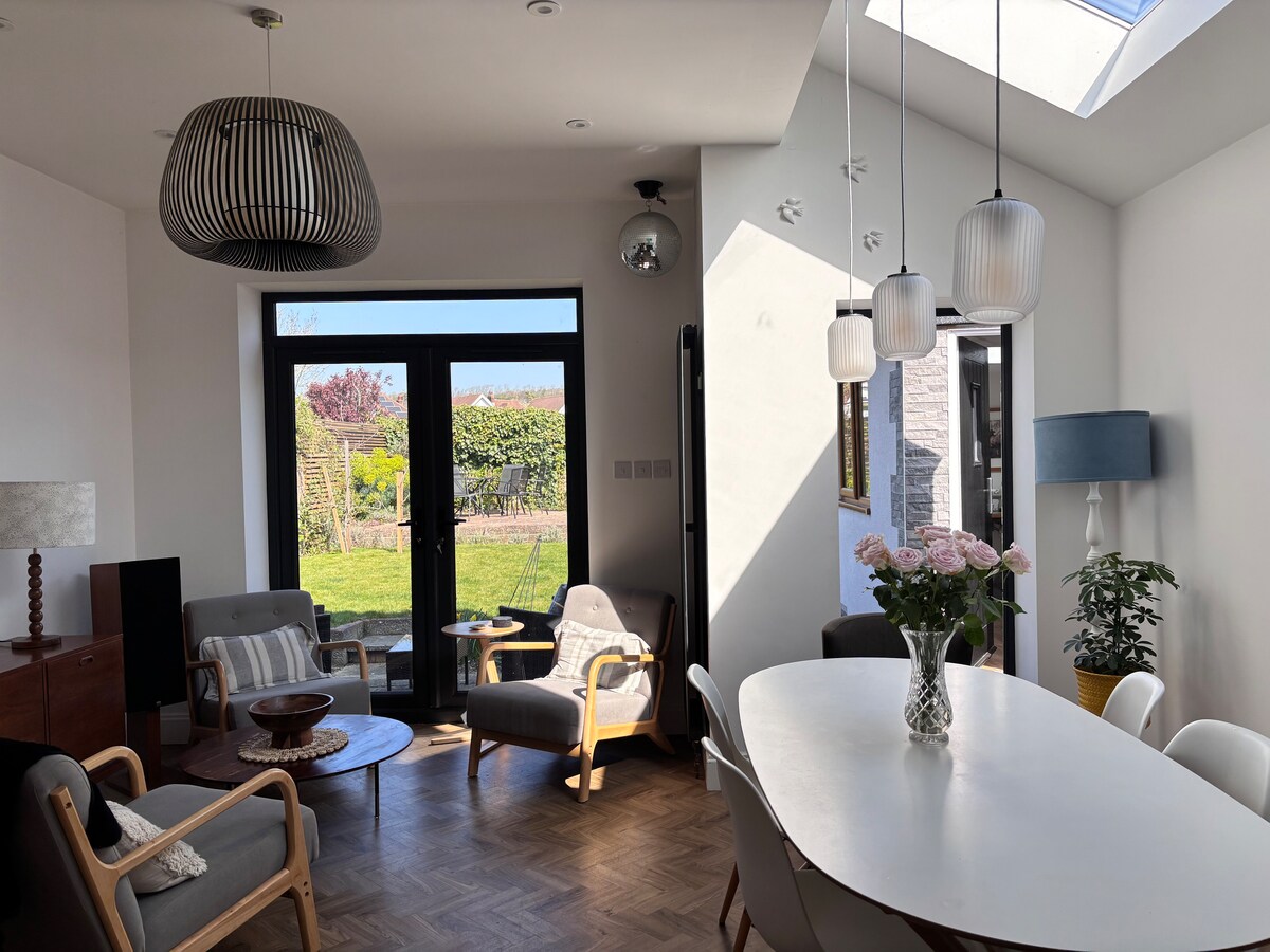 Light, airy and immaculate, but very comfortable, with 2 private parking spaces directly outside. Cosy sitting room with a wood burning stove and french doors leading to a modern garden with corner sofa and a separate table for alfresco dining. The house is very comfortable, for both families or groups, as both double bedrooms have their own bathroom and there is a third loo downstairs. The kitchen is open plan and fitted with all appliances to make your stay a home from home.