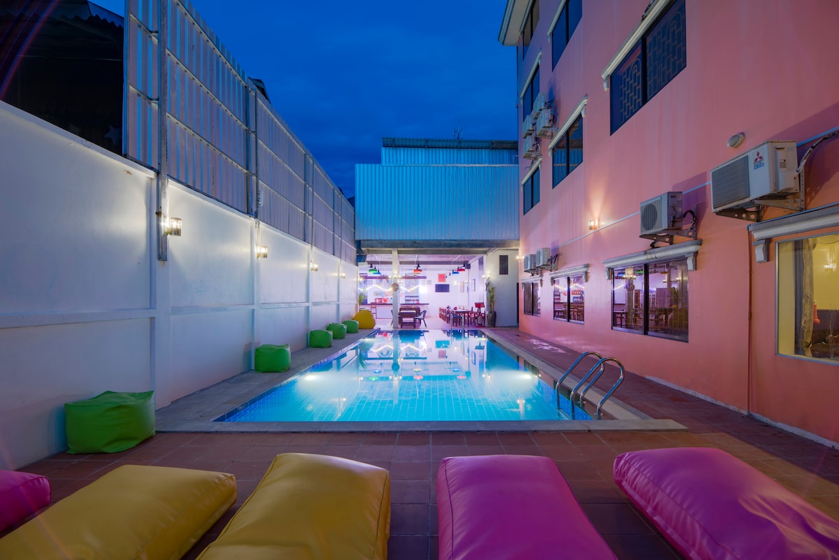 THE PLACE Hostel & Pool bar, situated in the center, offers a comfortable and social experience designed to make you feel right at home! Our pool area is a green oasis in the middle of the city and the stylish bar is a great place to drink a beer or Khmer iced coffee with your new friends from around the world! Our rooms are big, on a quiet little street. They have private bathrooms and all the comfort you need.