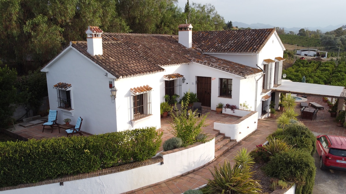 Rural 4-bedroom house with private pool in a certified organic orchard in a peaceful valley. Natural surroundings, minutes away from picturesque villages, 1/2hr from Málaga, international airport, high-speed trains, beaches, and Marbella. The house is located in a rural area inside of an orange grove. Enjoy the country's peace while being just a short drive away from picturesque villages, commercial areas, beaches, parks, restaurants, etc. You will need a car.