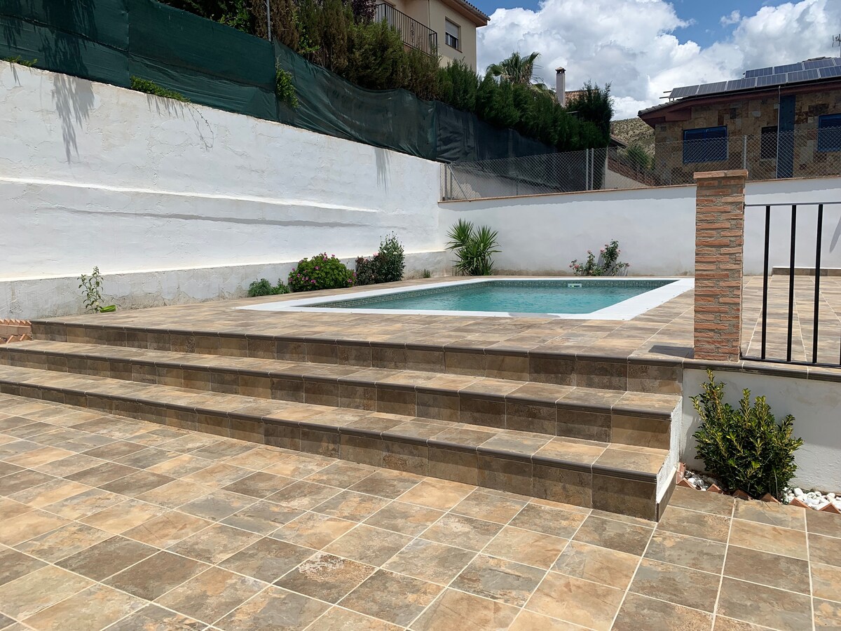 Alojamiento privado totalmente reformado en parcela de 600 m2. Zona tranquila, a 6 km de Granada, 20 km de Sierra Nevada y 49 km de la Costa Tropical. Acceso a Granada en autobús urbano y rápido acceso a la autovía. Dispone de tres habitaciones independientes y un sofá cama (ver fotos). No apto para eventos. Cocina, dormitorios y baño bien equipados. Caben dos coches en rampa de acceso. Piscina privada de agua salada.