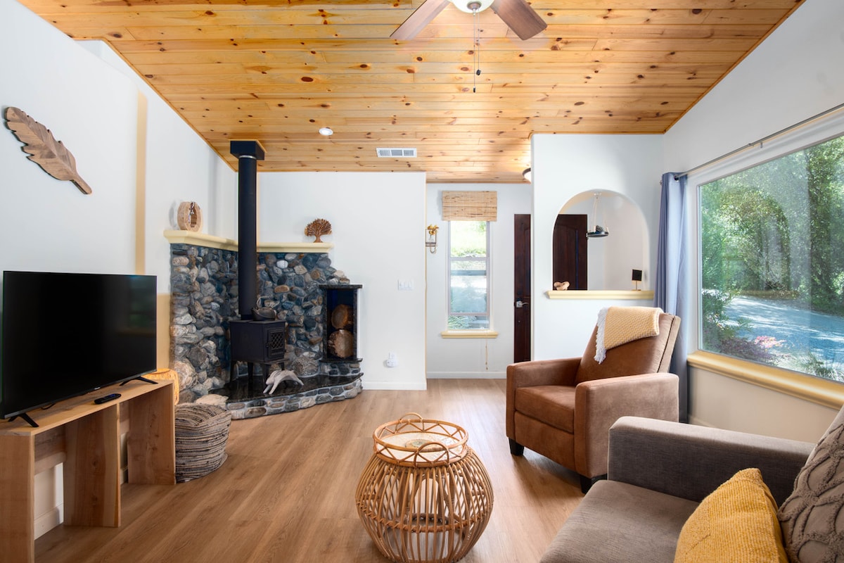 Nestled between rocks and trees, this cozy, modern cottage will make your stay unforgettable. Although the home is in the center of Three Rivers (you can even walk to the candy store and the Riverview), it totally feels secluded, since it is located on a private road. Relax on the patio after a day in the park, or settle on the couch to watch your favorite show on the smart tv. We offer good wifi and a desk for those of you needing to work. The bedroom is spacious and has a king size bed.