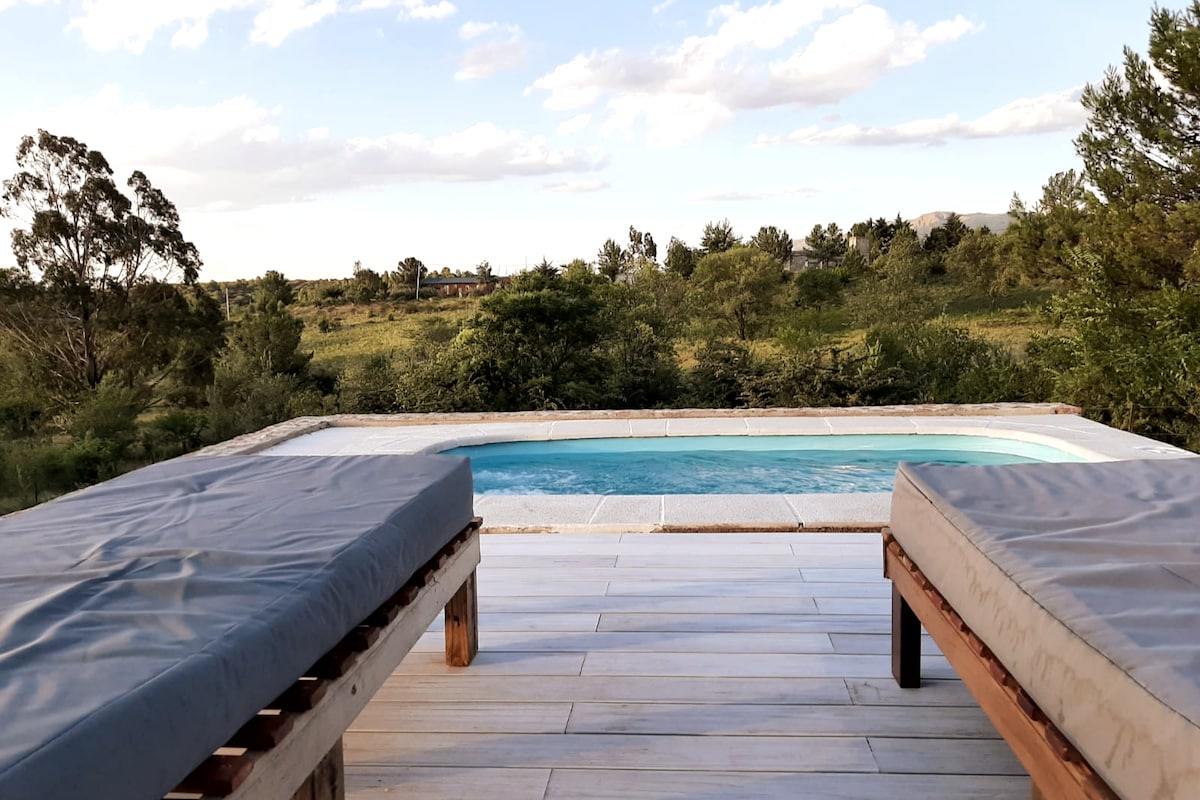 This beautiful country house overlooking the Cordoban low mountain ranges is located within the Los Quebrachitos Nature Reserve in the town of Unquillo, Cabana. It is located on a 5,000 m2 lot within a private property with restricted entry. Capacity for 5 people, 2 bedrooms, 2 full bathrooms, large living room, dining room, kitchen, gallery, deck with a chulengo, living room with sofa bed and TV, laundry room. Outdoor 7x4 pool and a large 42 m2 deck.