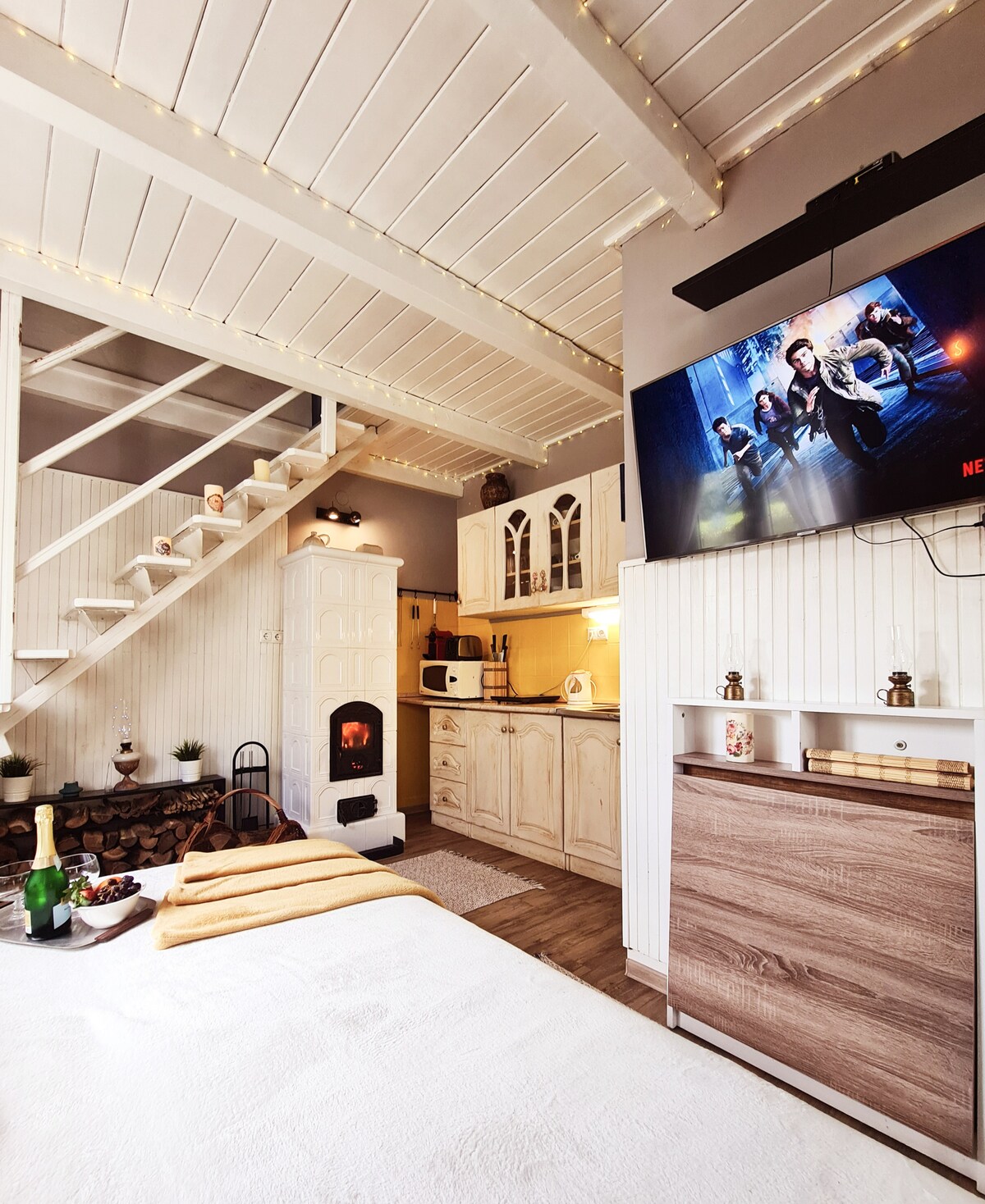 Our cottage is a blend of modern and rustic. The modern style fits the rustic and gives this cottage a special charm. Guests can use the entire house of 100 m2 and a yard of 2500 m2. On the enclosed, heated terrace there is a Jacuzzi in use all year round. A coffee maker and various types of tea are available in the kitchen. The bathroom is fully equipped: towels, bathrobes, slippers, shower gel, shampoo, conditioner, toilet paper, dental hygiene set, small cosmetic set. In the attic, a comfortable bed.