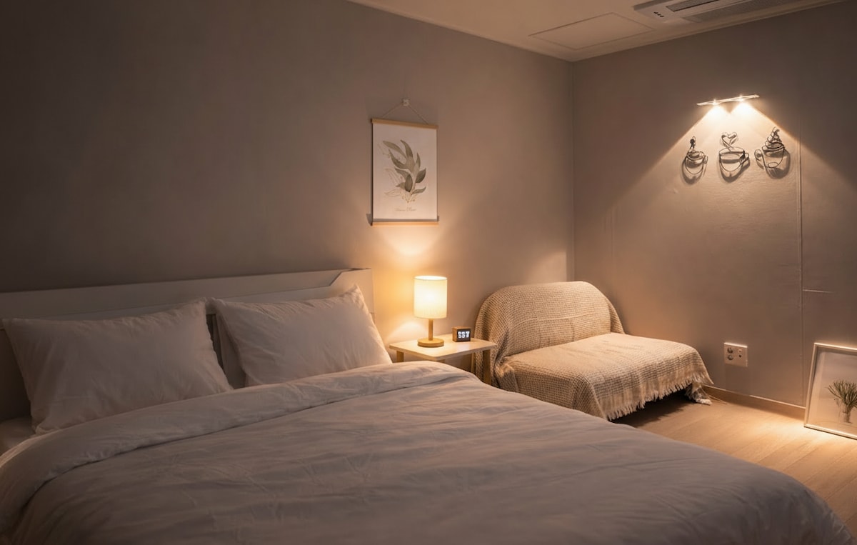 ♡ A tranquil retreat in the heart of the city ♡ A modern city view with a wonderful emotional sound is a bonus~^^ We have prepared it warmly and cleanly so that your ♡ loved ones can stay in the coziest and most comfortable space. Enjoy Netflix, Youtube, and over-the-air TV with a large smart TV equipped with a ♡ soundbar. ♡ Self Check in (When confirming the contract, check-in details will be provided non-face-to-face) Additional benefits are provided for ♡ long-term stays. ♡ All spaces are not allowed to smoke, no pets allowed [Parking instructions] Free parking is available in the accommodation, but please understand that parking may be flexible on weekends or late check-ins.