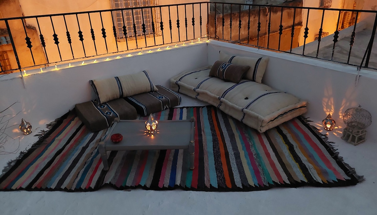 Si vous voulez passer un séjour au coeur de la Médina de Tunis, notre maison est faite pour vous ! Profitez des ruelles du centre historique de Tunis, tout en étant sur le boulevard traversant la Kasbah. La maison est constituée d'une salle de séjour, une chambre (un lit 2 places), un bureau et une salle de douche. Le charme de la maison repose essentiellement sur sa terrasse qui surplombe la Médina, lieu unique où vous pourrez contempler le coucher du soleil autour d'un bon repas ou d'un verre.