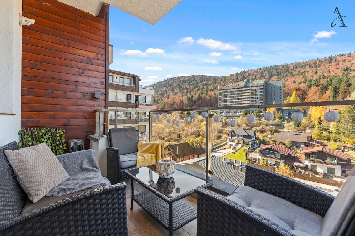 O oază de confort și eleganță, acest apartament cu două camere vă întâmpină cu un dormitor confortabil, iluminat cu leduri pentru o atmosferă relaxantă. Livingul spațios emană o simfonie de culori calde. Bucătăria este complet utilată, iar locul de luat masa este perfect pentru a vă bucura de fiecare masă. Cu un balcon generos ce oferă acces din ambele camere, veți fi răsfățați cu o priveliște panoramică asupra muntilor, creând un cadru magic pentru fiecare moment petrecut aici.
