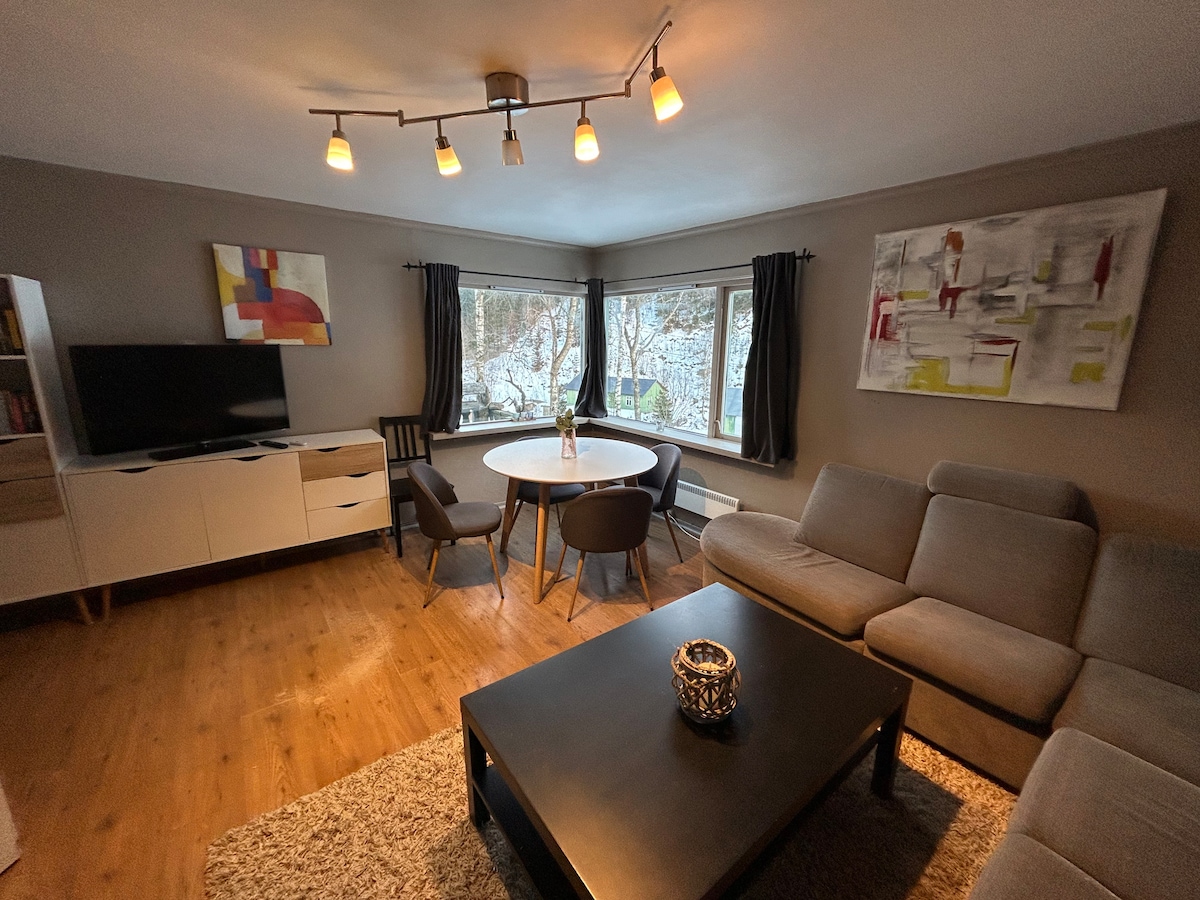 Central, but private, apartment with excellent sun conditions. Enjoy late days in the sun, watch a good movie on the couch or go for a walk right outside the door. Contains everything you need for a break from everyday life, and is excellent for families who want a trip to the mountains. You can drive all the way to the door in all seasons. Proximity to shop, ski slope, hiking trails, fishing. We have a dog ourselves, and you are welcome to bring a dog if you wish. Please send us a message if you have any questions.