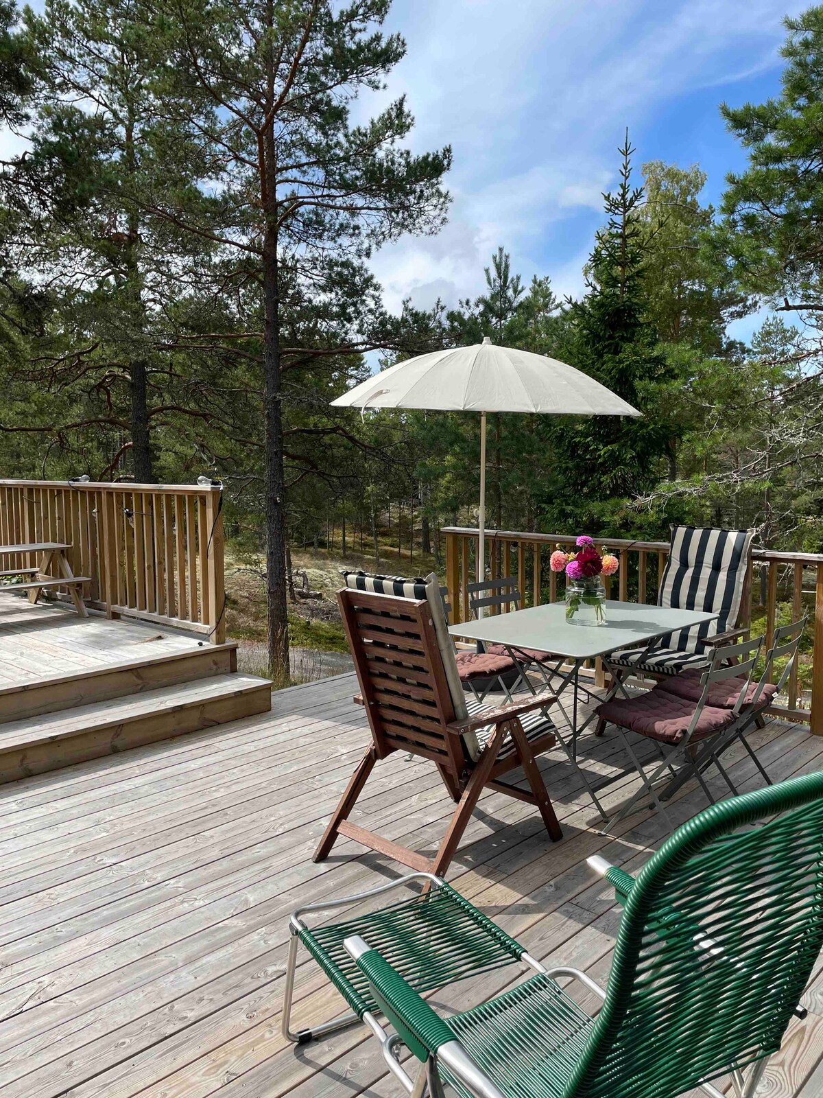 Cozy and fresh house with fantastic view and sun all day/evening. The house is located high up with a porch that goes around the house. Unobstructed view of Horsfjärden. The house has three rooms and a kitchen. Lake view from all rooms. Bedroom 1 with double bed, bedroom 2 with wide bunk bed (120 cm down there). In close proximity to the house, there is a guest house with a wide bunk bed and toilet. Close to beach with diving tower, golf courses, café, restaurant, shop, boat to Utö. 30 minutes from Stockholm by car. Convenient public transport.