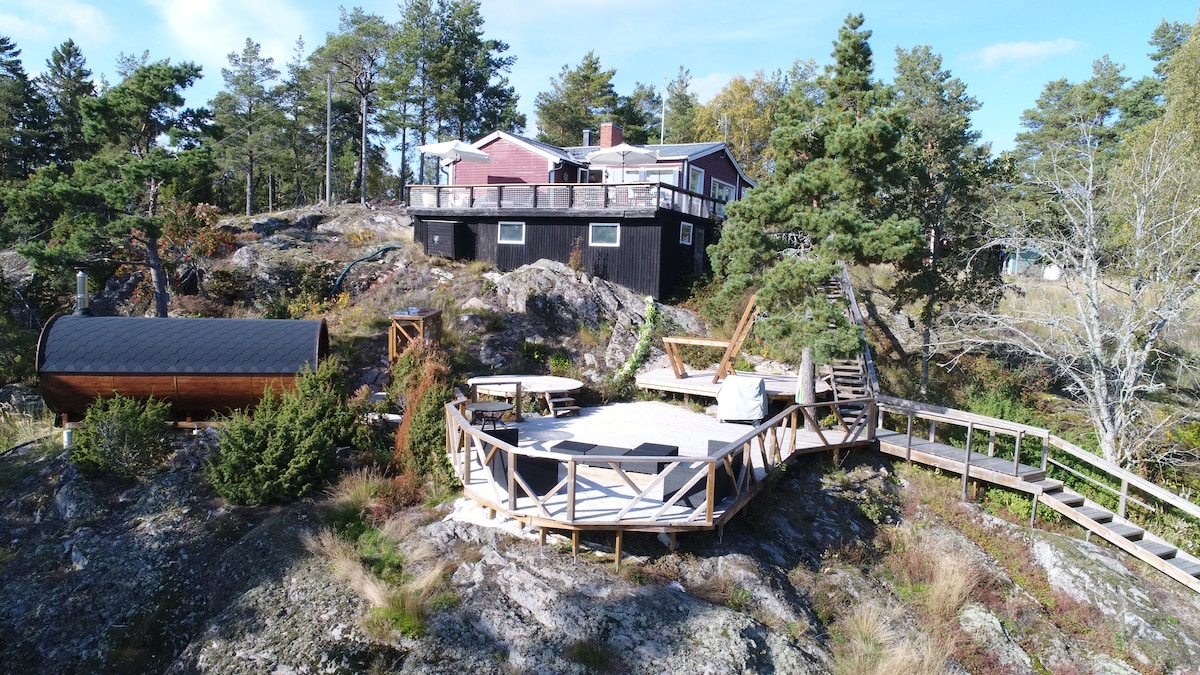 House by the sea on a jetty👍Enjoy the hot tub and wood-burning sauna. Fantastic outdoor environment. Modern and fully equipped house, tastefully decorated. Perfect experience for those who want to have a relaxing and beautiful time on the water🌞 If you want to be active: canoe, hike in the nearby national park, go for a run or go boating. All this just 30 minutes from Stockholm! Imagine spending a few days or weeks in this environment 😀 - All space is privately available to you as guests.