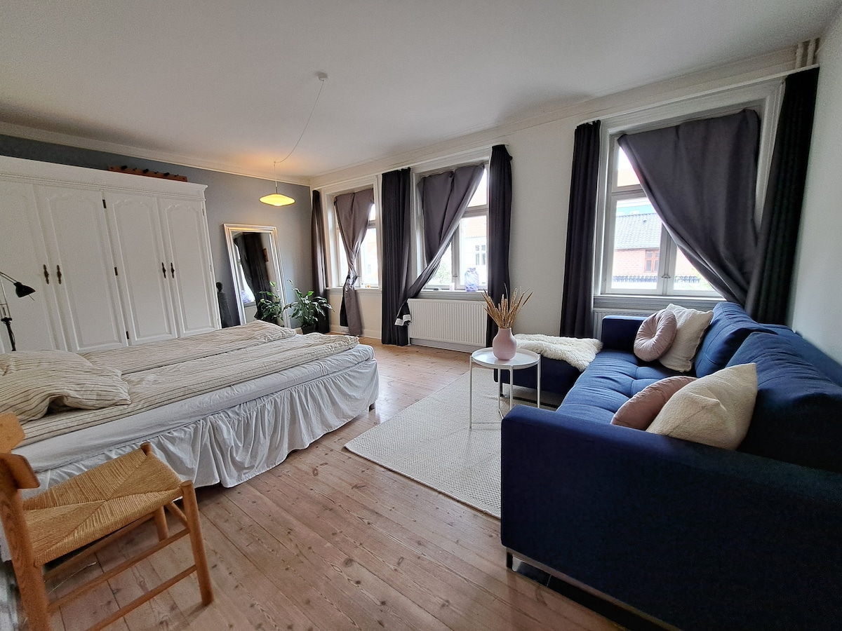 Stay centrally in Skanderborg with a 10-minute walk to the city's many shops and eateries. There is a 5-minute walk to the forest and the lake with a swimming bridge, canoe rental, mountain bike trails and hiking trails, as well as a 12-minute walk to the station with trains to Aarhus (15 minutes) Silkeborg and Copenhagen. It is 3 km to the E45. The apartment has a private entrance and consists of an entrance, living room, bedroom, bathroom and kitchenette. The house has a large south-facing terrace and a lovely garden.