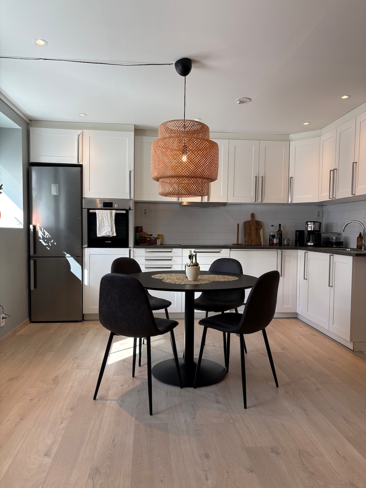 Enjoy a stylish experience in a centrally located place. In the middle of Skien city center with a great view of the city center and a newly established park. There you will find a French bakery and pizzeria. The apartment is fully furnished and has ventilation and large, great windows. Heating cables in the bathroom.