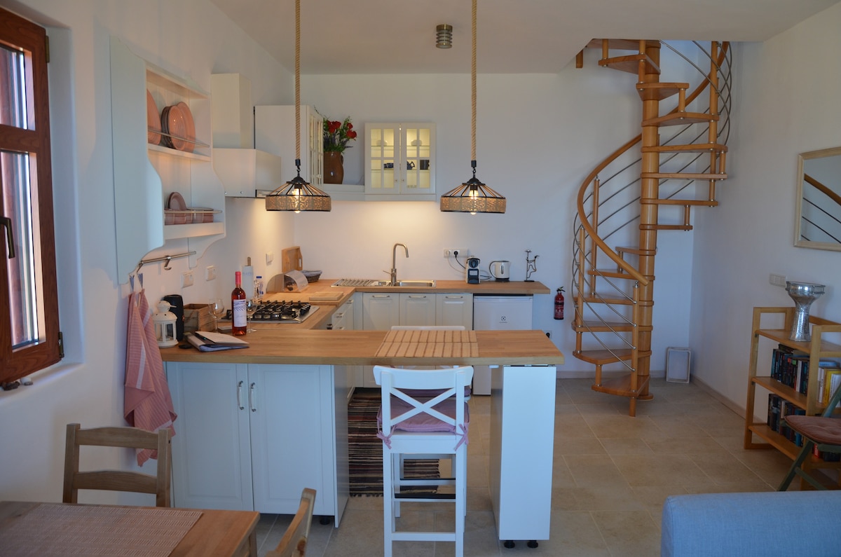 A beautiful guesthouse for two people, within walking distance to one of the most beautiful beaches on the south coast of Crete. This guesthouse consists of two floors connected by a beautiful wooden spiral staircase. The ground floor has a nice living room with a fully equipped kitchen, kitchen bar, sofa (able to be converted into a full double bed), and a dining table. The upper floor has a large bamboo bed (1.60m), balcony, and bathroom.