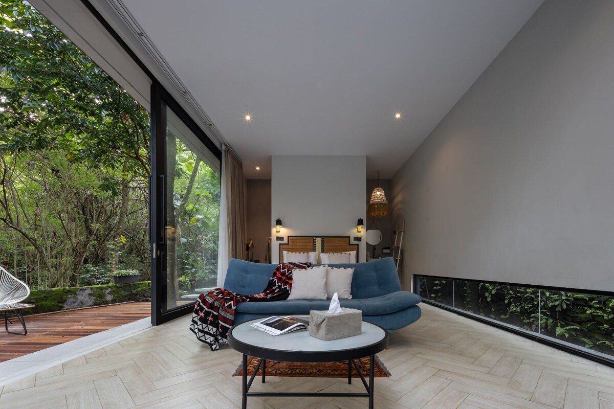 Nestled deep within a lush forest, this modern cabin villa offers a serene escape where nature & modern design blend seamlessly. Surrounded by mature trees, vibrant greenery, the villa feels secluded yet welcoming. The Villa has space for guests to enjoy breakfast /dinner in an outdoor restaurant adorned with vibrant greenery. Large sliding glass doors in the room allow natural light to pour in Ideal for couples, small families / anyone seeking tranquility, privacy & connection with nature.
