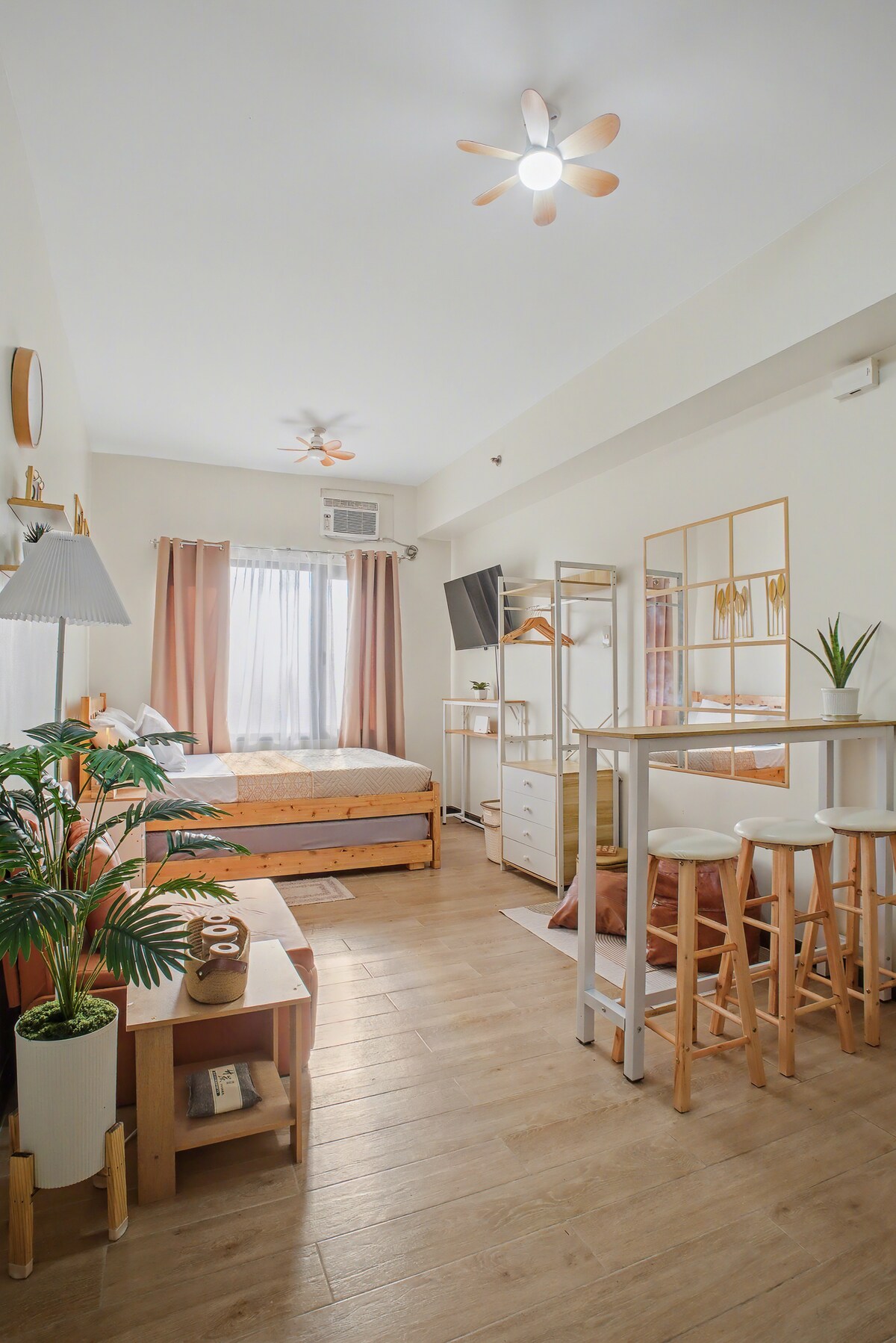A luxurious smart condo with cozy balcony, swimming pools, free WiFi, Netflix, Xbox, air purifier and keyless entry. Walking distance from mall and minutes away from airport. *Keyless Access *Xbox *50Mbps WiFi *Netflix & YouTube *43 inch Smart HDR Internet LED Sony TV & Sony Soundbar *Bose speaker *Air Purifier *2 hp inverter A/C *Ceiling Fan *Double bed w/memory foam mattress & luxury linnen *Hot & Cold Drinking Water Dispenser *Hot Shower *Washing Machine *Complete Kitchen! *28.19 sqm
