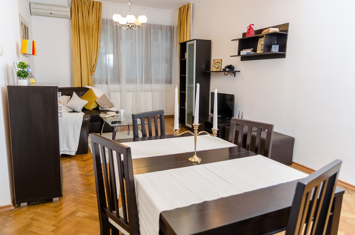 The whole apartment was fully renovated in December 2016! It is fully equipped with modern appliances and all amenities for a long, comfortable stay. The apartment is fully furnished and has everything you need for a pleasant and comfortable stay in Sofia. It has two private bedrooms, a fully-equipped kitchen with dining area and place for relax and a bathroom. We provide a free parking place secured with a gate just in front of our building!