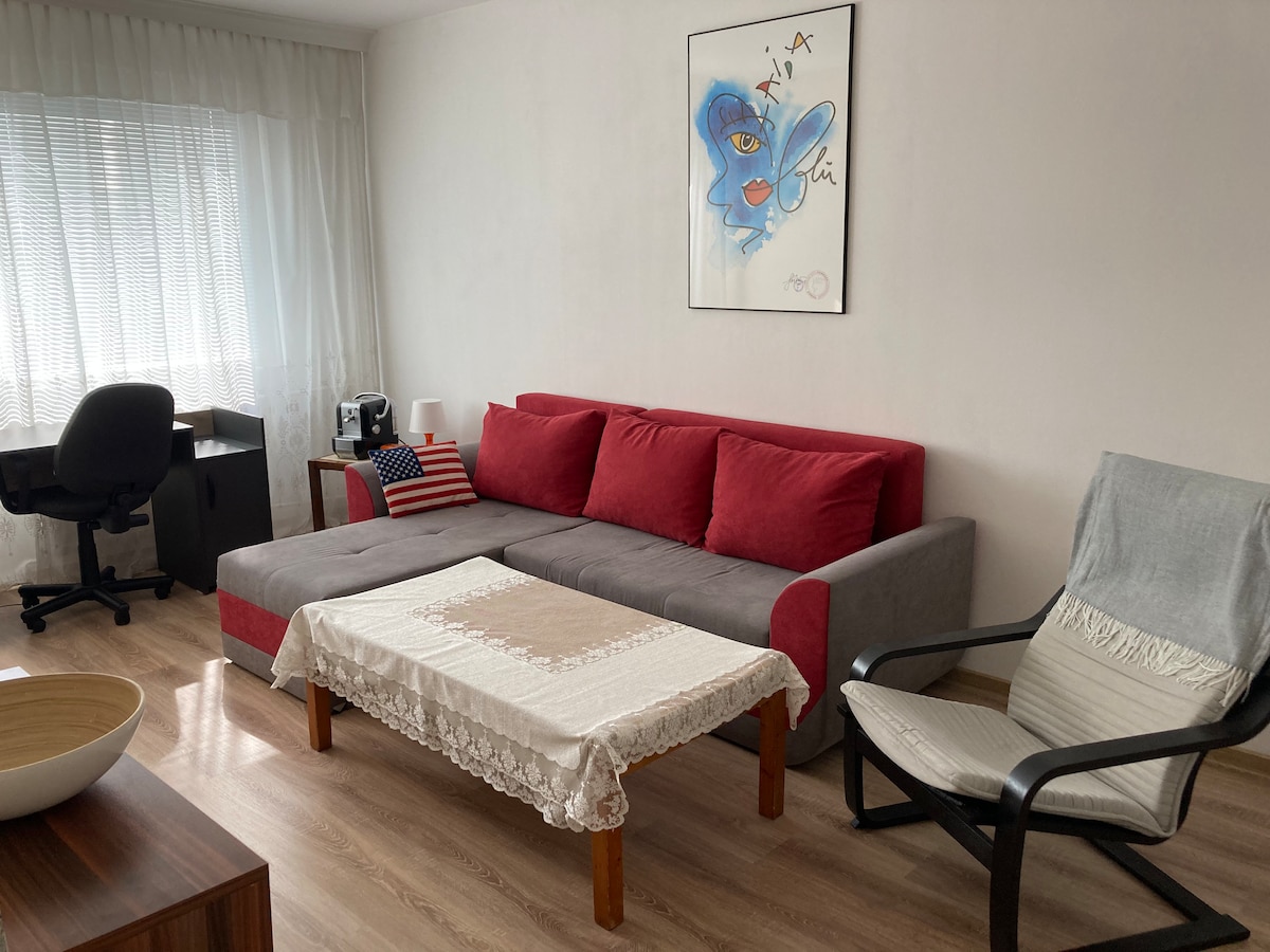 Cozy one bedroom apartment with a nice sitting room with extendable sofa, central heating in "Galaxy Trade Center" building, with a secure parking, shops and restaurants. It is a 5 min walk to a central Bus stop "Pliska"-which is 10 min away from the city center and has direct connection with airport by buses 84 and 184. Main concert and sports hall Arena Sofia is 15 min away. Located in a very safe town area, just next to a police station, Ministry of Exteriors, Embassies, Malls, banks, parks.