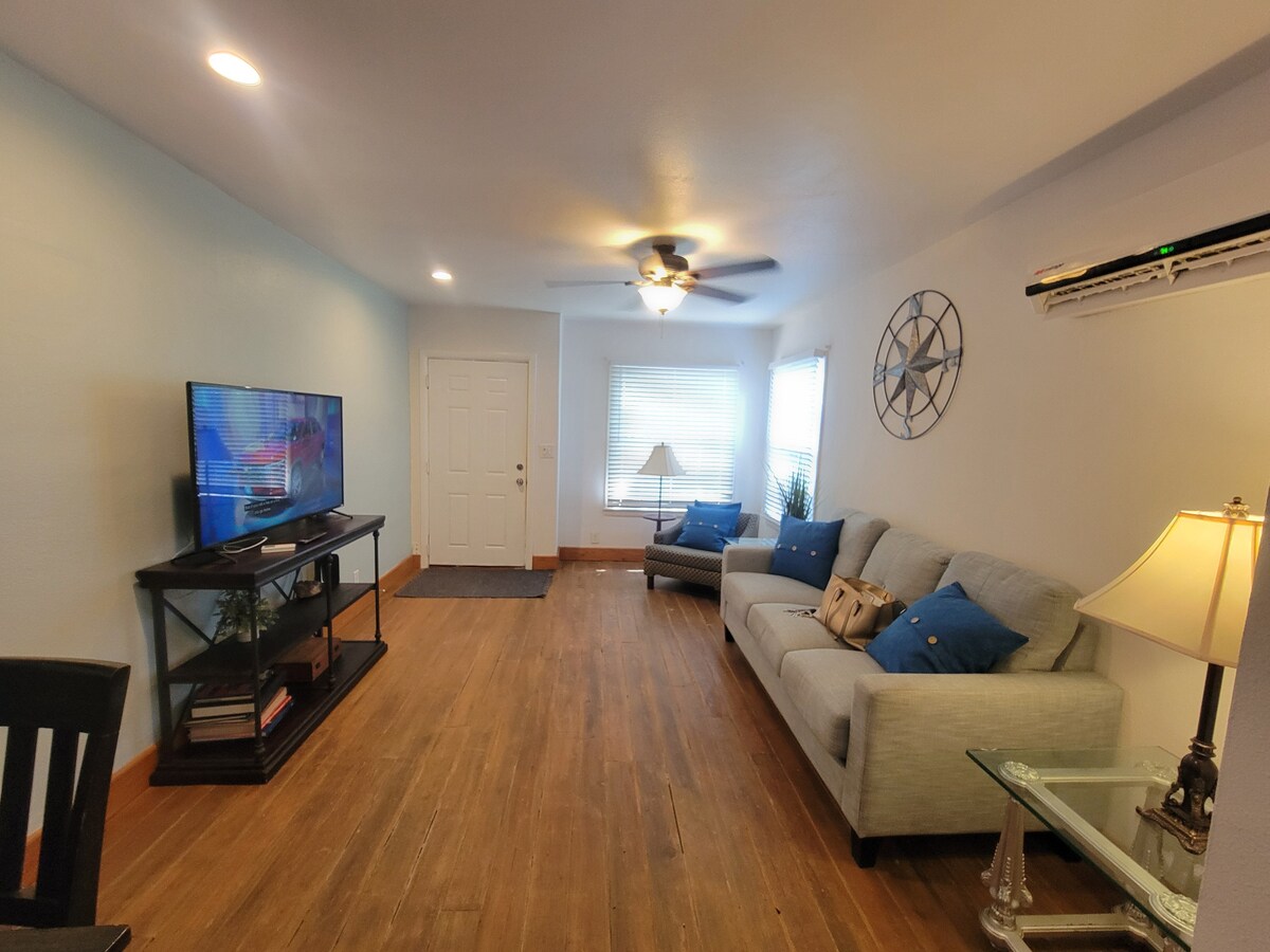 Soak up the vintage charm of this fully renovated Duplex apartment, reclaimed old wood floors, kitchen, fridge, stove/range, microwave, 2 large smart tv, living room, queen bed , modern bathroom with vessel sink limestone vanity top, private patio and yard, mature mesquite trees, dining table, table desk, a block away from Business 77, restaurants, stores, parks, walking and biking trails and the Ramsey park bird center, close to Valley Baptist Hospital and UTRGV Harlingen Campus.