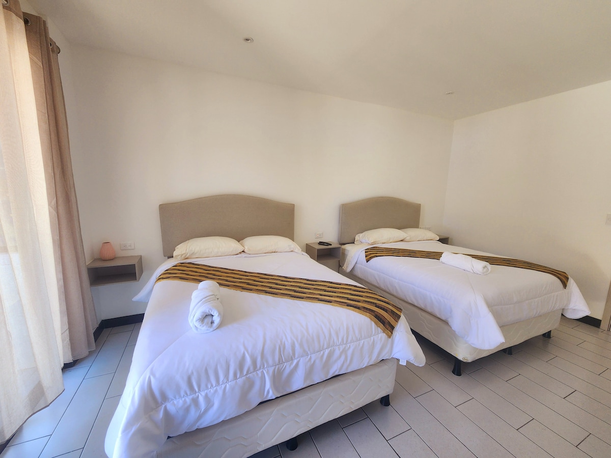 Hospédate en una amplia habitación con dos camas matrimoniales, ideal para 2 a 4 personas. Incluye desayuno gratuito en el rooftop con espectaculares vistas al lago y volcanes. Disfruta de atención 24 hrs, recepción dedicada y espacios modernos diseñados para tu comodidad. La habitación cuenta con cafetera con café y té, agua de cortesía, secadora y baño privado. Perfecta para familias o grupos que buscan confort y una experiencia única en Panajachel.