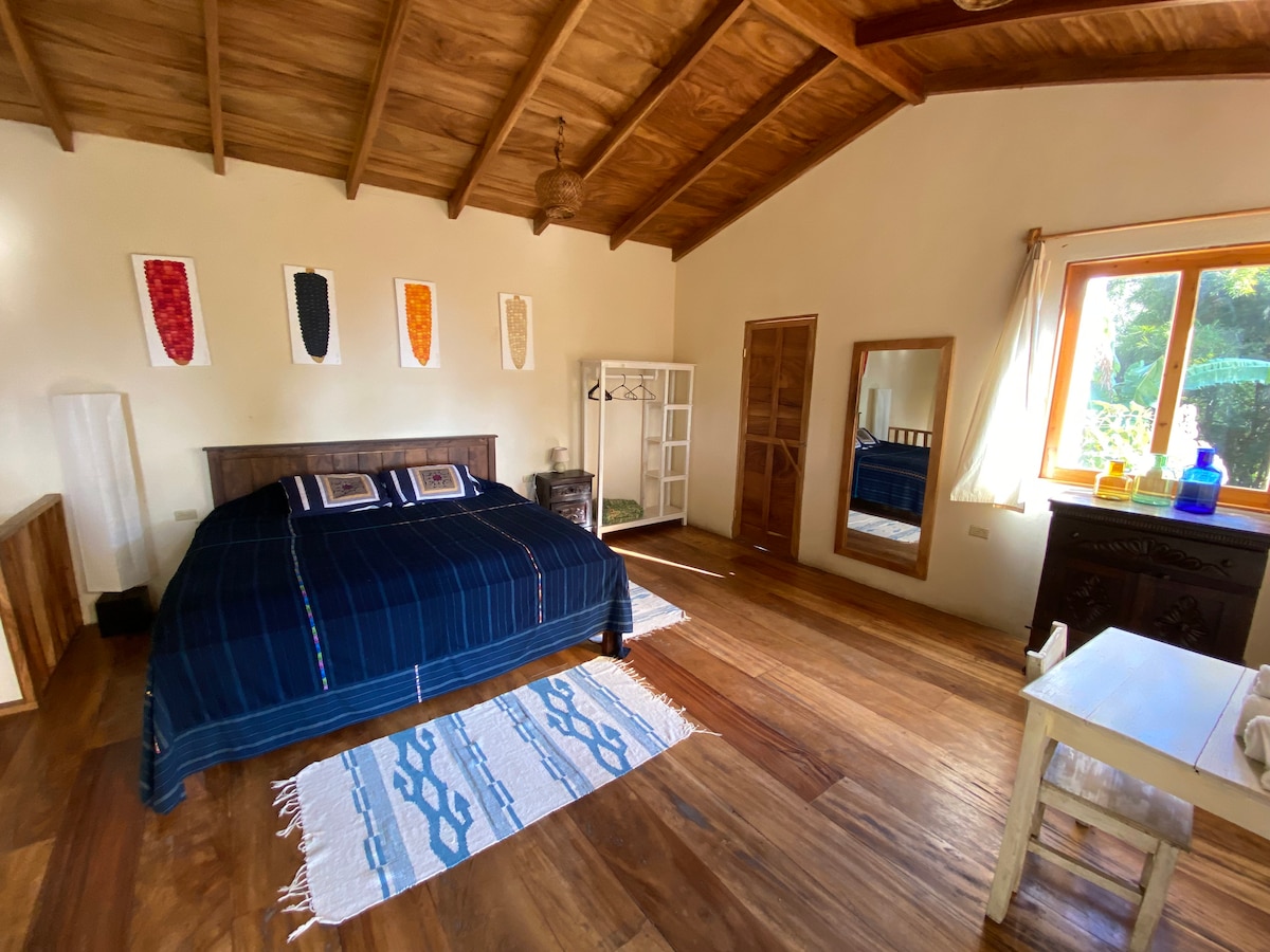Relax in our cozy, high-end ensuite featuring a handcrafted queen bed by local artisans and modern appliances. Step out to the stunning views of Lake Atitlán, lush gardens, and majestic mountains, creating a peaceful haven for ultimate relaxation. Savour your meals in the sharing elevated outdoor kitchen directly in front of the room, offering a perfect setting to take in the spectacular scenery. Enjoy private access to our pool, sauna, jacuzzi and private dock throughout your stay!
