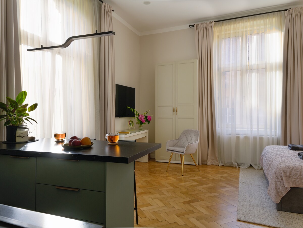 Calm and comfort await you in the Day One studio in the center of Fagaras. Here you will find a beautifully arranged space with a generous double bed, an open space living area with the kitchen, and from the "sic" terrace you can admire a large garden.